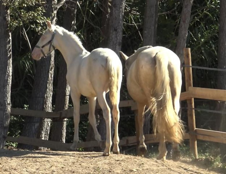 Identity 2056: Beautiful licensed PRE Palomino broodmare with the very best character and a stunning Cremello filly. Mother and daughter are for sale, both are very well trained and possess excellent characters, and are lovingly cared for. No vices present. The filly is a dream, is 6 months old, and the mother was born in 2019.