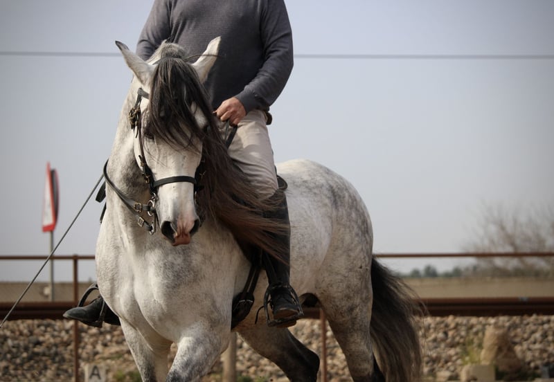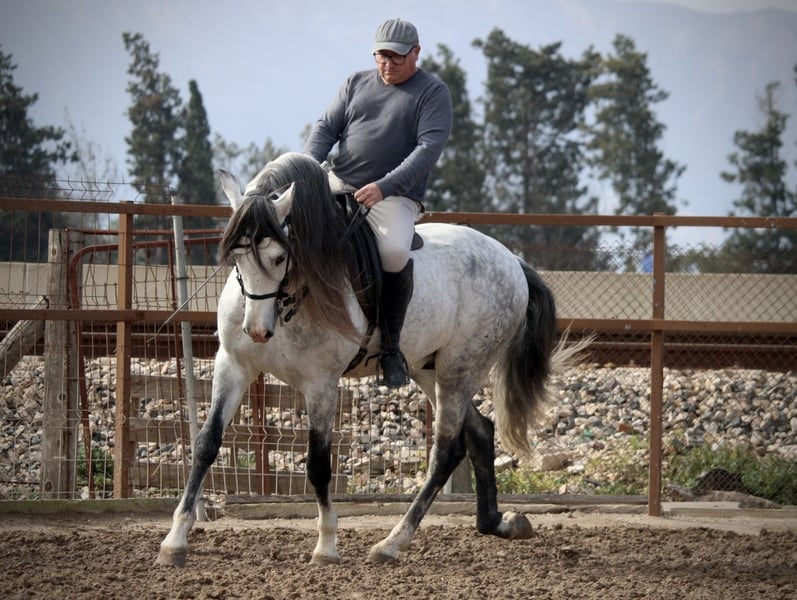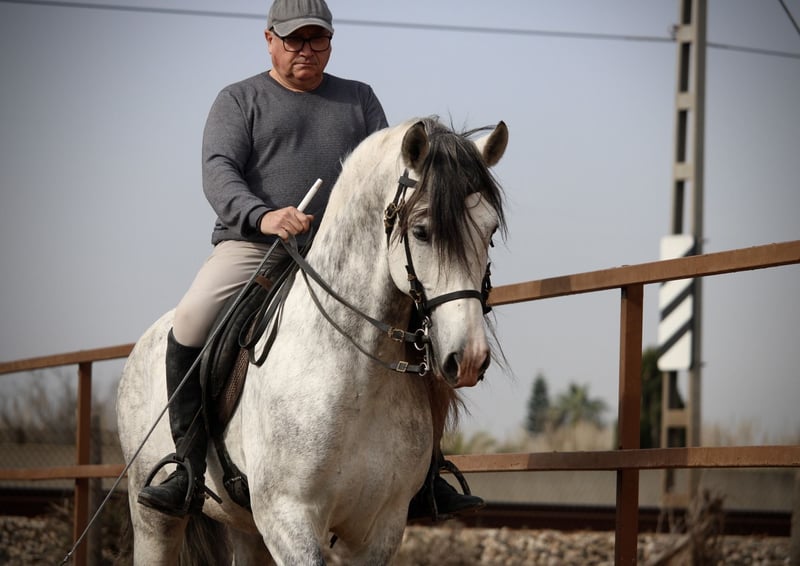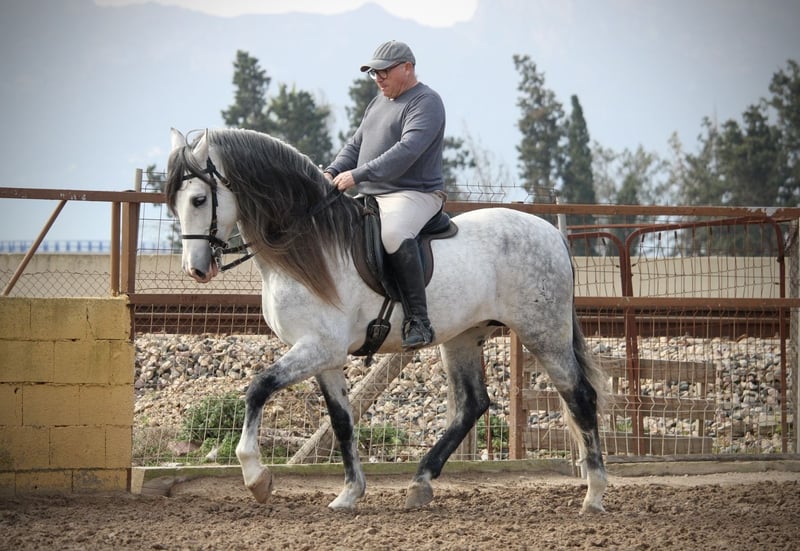 Fans and lovers of the old lines take note: this smart stallion comes with really exceptionally good paper. He is purebred Cartujano for generations, without exception via the stamp brand of the Cartujanos, the Hierro del Bocado. Such paper is very rare today, if it exists at all. Apart from his noble origins, this great guy has an extremely sweet and reliable character. He is used to going out on his own and also to taking part in parades and events. He masters the principles of lateral movements (leg yields, traversals) and even some Spanish walk and passage. Free of mold melanoma. Location Spain.