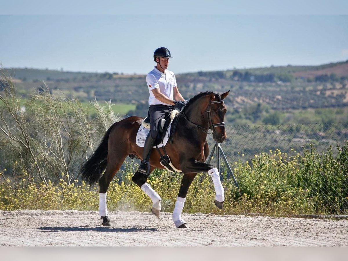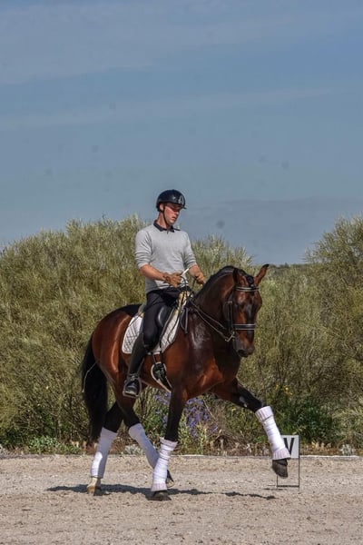 Schoolmaster Piro Free PRE Stallion, born in 2016, currently performing nearly all Grand Prix exercises. He boasts the finest bloodlines from Yeguada Militar, being a son of CERRO (a licensed and recommended stallion), combined with Escalera bloodlines from the dam. His height is 168 cm, with a beautiful sport conformation. He has three elegant gaits: a large, expressive walk and canter, and a suspended, expressive trot. His temperament is easygoing, sensitive, and comfortable, making him very rider-friendly. He has been trained in PSG-level movements, including piaffe and passage, and is working on 15 x 1 tempi changes with a simple snaffle or double reins. Currently, he can perform nine tempi changes, making him GP-ready. He moves softly, light, elastic, and flexible, maintaining a soft and steady contact. He is easy to move forward and to collect, demonstrating a smooth, balanced ride. Gentle and respectful with people and other horses, he is a sweet-hearted horse with excellent character—free of spookiness, stallion manners, and fully trustworthy. He is accustomed to working alone or with other horses and mares in the arena, as well as riding in the countryside, both alone and with company. Suitable for an amateur rider (the girl in the pictures) or a professional. A top opportunity to compete at PSG level and soon at Grand Prix. Located in Spain 🇪🇸 More information via WhatsApp: +49 176 9973 34 More horses: https://t.me/toplusitanos Jasmin from Top Lusitanos 🤗