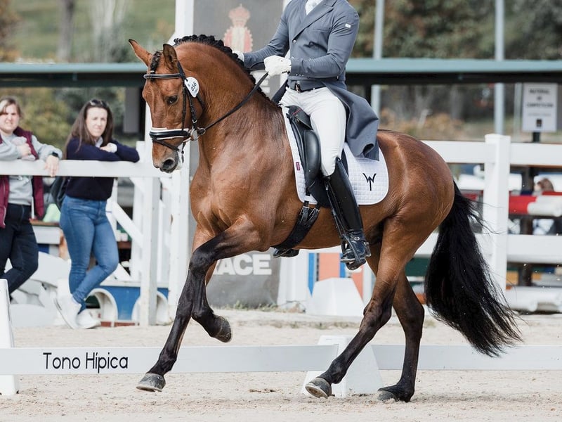 Este precioso caballo PRE de aspecto impecable y con una morfología bien proporcionada, goza de unos andares bien equilibrados, mostrando una gran fluidez en los cuartos traseros y una buena acción de los cuartos traseros en cada paso. Bajo la silla de montar, este caballo ofrece un paseo cómodo, manteniendo un contacto ligero y agradable, siempre con ganas de avanzar. Este precioso caballo español se esfuerza por complacer a su jinete, tratando de dar lo mejor de sí mismo cada día. Cuando está montado realiza hermosos ejercicios laterales, piruetas y cambio de vuelo a tres tiempos, con experiencia en competencia creemos que es un caballo muy interesante para un jinete aficionado que quiere seguir construyendo sobre el trabajo que ha realizado para continuar al siguiente nivel. Sus orígenes son fabulosos, es nieto y bisnieto por parte paterna de criadores cualificados de la yeguada Dehesa de Cabeza Rubia, yeguada conocida por la funcionalidad de sus productos. Su línea materna tiene excelentes orígenes, así como por parte de su padre, sus abuelos y bisabuelos maternos también son criadores calificados, lo que lo convierte en un caballo a tener en cuenta no solo para la doma, sino también para la cría de sementales. Chequeo veterinario disponible, para posibles clientes interesados.