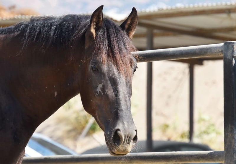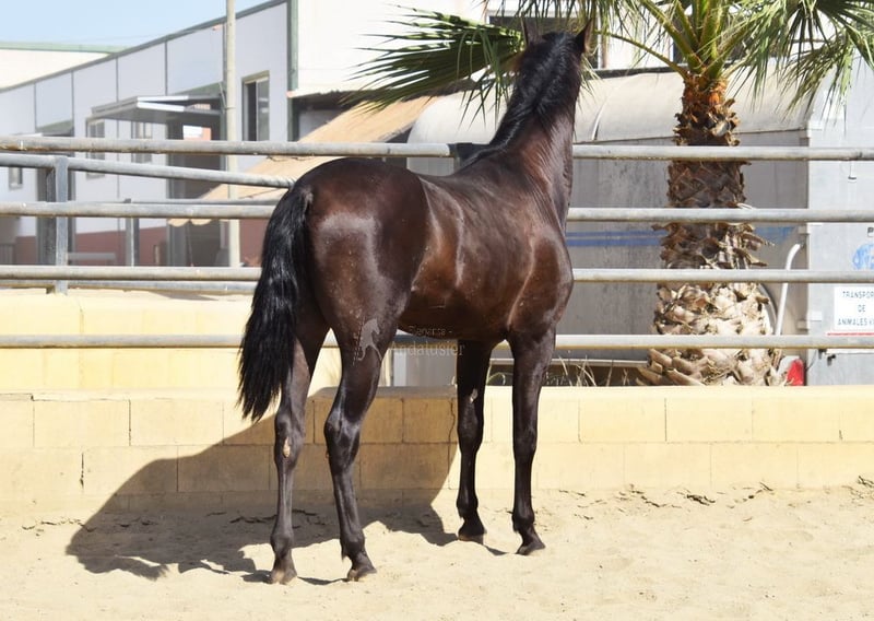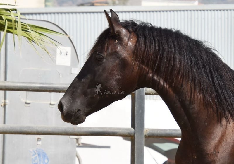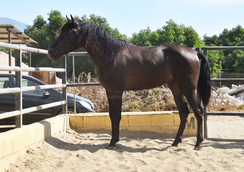 lieber Charakter, roh, wurde vor Kurzem aufgestallt, groß, gute Bewegungen, Rappe mit PRL-Gen, Abstammung: Manuel Fernandez Jimena, Paco Marti www.elegante-andalusier.com