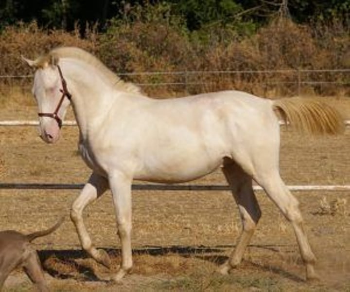 Junger Perlino mit Potenzial zum exzellent Hengst Dieser einjährige Perlino vereint alles, was ein erfahrener Züchter sucht: Genetik, Morphologie und eine Präsenz, die selten zu diesem Preisniveau zu finden ist. Durch die Analyse der ANCCE bestätigt und Träger des ggCrCreE-Gens, zeigt er ein leuchtendes, sehr begehrtes Perlino-Farbenspiel – perfekt, um jedem Zuchtprogramm Farbe, Eleganz und Noblesse zu verleihen. Mit barocker Konstitution, gut gebaut und mit harmonischen Proportionen besticht er zudem durch einen ausdrucksvollen, flüssigen Bewegungsablauf. Trotz seines jungen Alters zeigt er bereits ein ruhiges und kooperatives Wesen, ist leicht zu handhaben und sehr lernwillig. Dies ist eine echte Gelegenheit für alle, die einen vielversprechenden zukünftigen Hengst suchen – zu einem außergewöhnlichen Preis für die Schönheit und das Niveau dieses Fohlens. Ein junger Pferdeprofi mit klarer Perspektive und einer Ästhetik, die für sich spricht. IberHorse: Wir wählen mit Sorgfalt junge Talente für Reiter und Züchter aus, die Noblesse, Qualität und Authentizität schätzen. Wenn dieses Perlino zu Ihrem Zuchtprojekt passt, kontaktieren Sie uns für einen Termin zum Telefonieren oder kommen Sie es persönlich kennenlernen.
