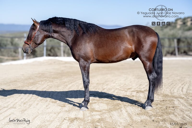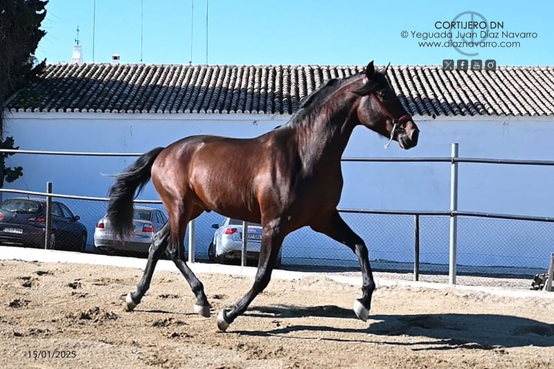 Intelligent colt with very good character. Working under saddle with cinchuelo and fixed rein. Shortly, small rides. Three good gaits. Lines: Velero XI, Rumex, Corzo IV, Obcecado, Levitón, Llamativo II, Ulster. Ventura Camacho, Granda, Yeguada Militar, Vizconde de la Montesina, Urquijo, D. Benito Zoido, Bohorquez.