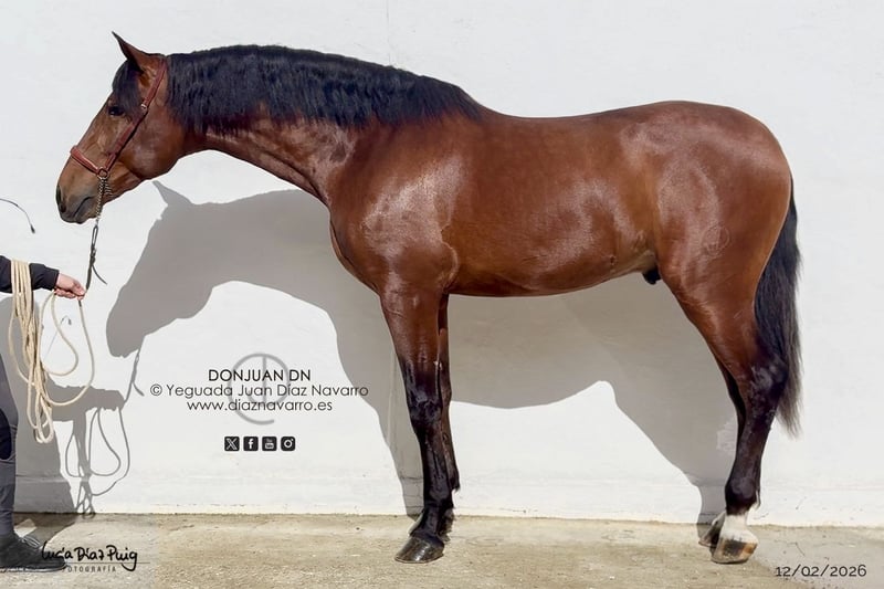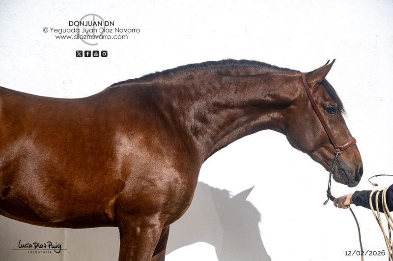 Semental de 2023, Castaño, 175 cm de altura https://diaznavarro.es/donjuan-dn Presentamos un impresionante semental nacido en 2023, con una estatura de 175 cm y un hermoso pelaje castaño. Este joven caballo muestra un potencial excepcional para el trabajo en doma clásica y otras disciplinas ecuestres. Su estructura sólida y su presencia noble reflejan una genética prometedora, ideal para caballeros y criadores que buscan un futuro estrella en el mundo ecuestre. Con un carácter equilibrado y una buena disposición para el entrenamiento, este semental ha sido bien manejado y está acostumbrado a la vida en el establo y a la interacción con personas. Su línea, combinada con su físico destacado, lo convierten en una opción muy interesante para quienes desean invertir en un caballo con gran proyección. No dudes en contactarnos para más información o para concertar una visita y conocer de cerca a este prometedor ejemplar.