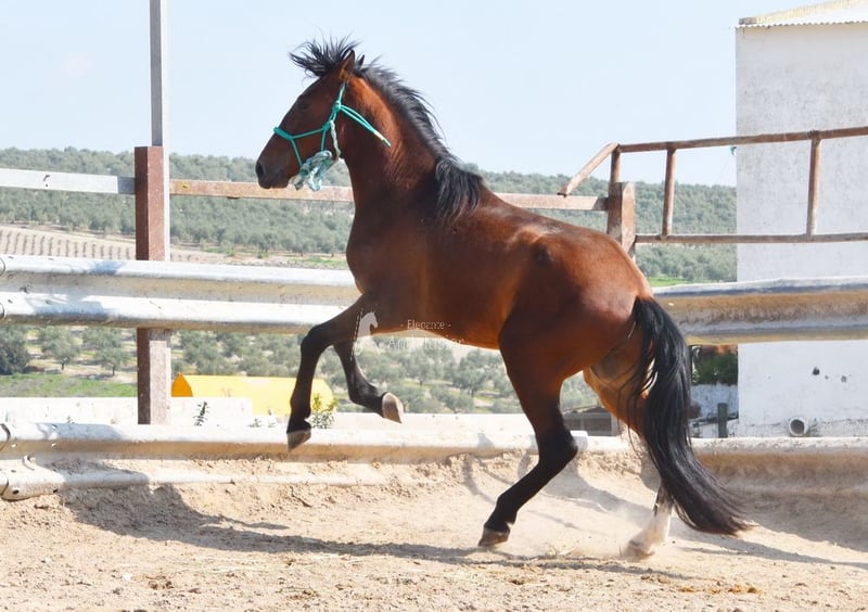 Handsome young dark bay PRE stallion with good movement.