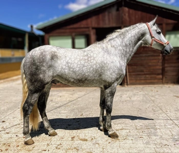 💫💖 Snow 💖💫 .... ein eleganter und fleißiger PRE Hengst, möchte gern in sein FOR EVER HOME vermittelt werden. Er hat keinerlei Hengstmanier und ist sehr gut erzogen. Er besticht jetzt schon durch seinen barocken Typ und durch sein edles Erscheinungsbild sowie seine anmutige Ausstrahlung. Snow ist seinem Alter entsprechend Basis geritten in allen Gangarten, und zeigt großes Talent für Dressur. Immer motiviert-ohne zu ehrgeizig zu sein, wurden mit ihm Seitengänge wie Schenkelweichen, Schulter herein und Travers begonnen. Er ist immer zu 100% bei seinem Reiter und will alles richtig machen. Auch geht er brav und mutig ins Gelände.Mit einem Stockmaß von 159 cm vereint er typische PRE-Charakteristika mit einem harmonischen Körperbau. Mit seinem einzigartigen Charme idt er freundlich im Umgang und zeigt viel Potenzial für Dressur, Zucht oder Freizeit. Bei Interesse oder weiteren Fragen stehe ich Ihnen gerne zur Verfügung. Eine Besichtigung und Probereiten sind nach Vereinbarung möglich. Wem dieser wunderschöne Apfelschimmel gefällt, meldet Euch bitte mit Telefonnummer, damit ich schnellstmöglich Kontakt zu Euch aufnehmen kann.