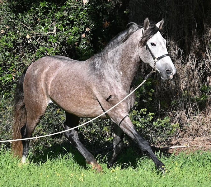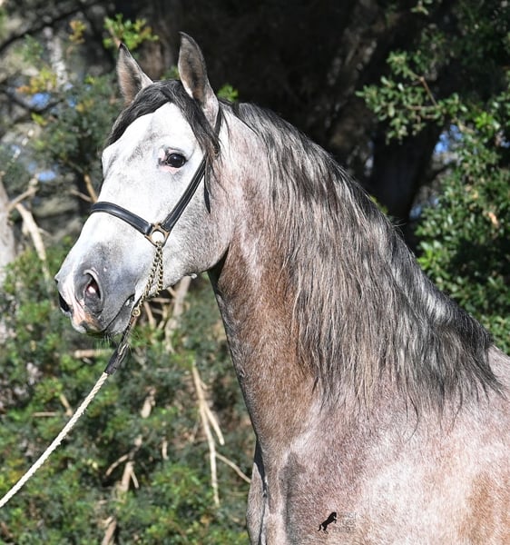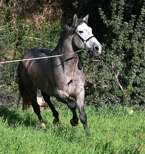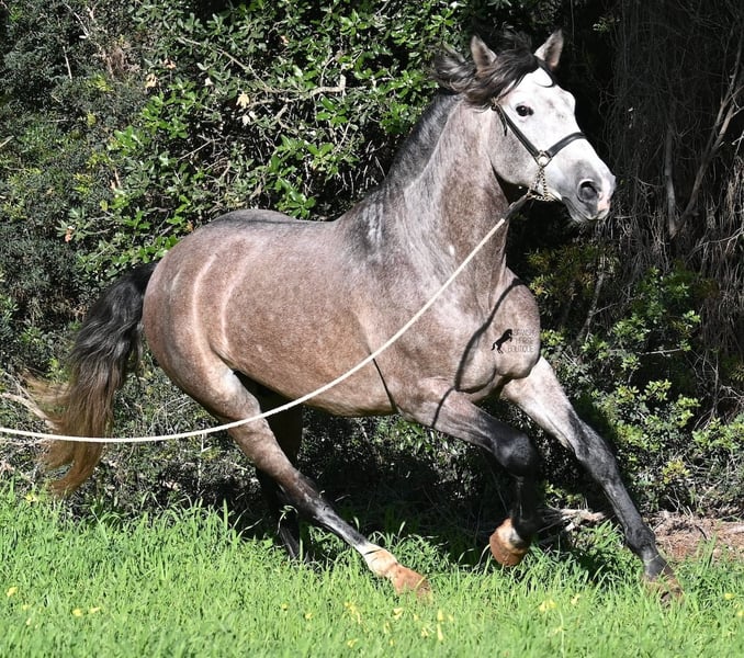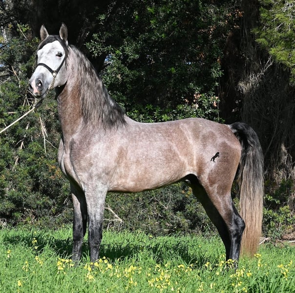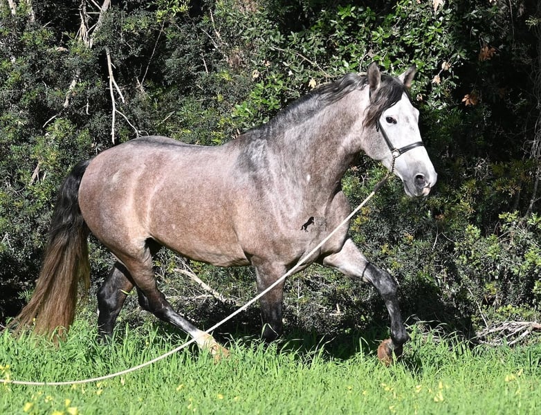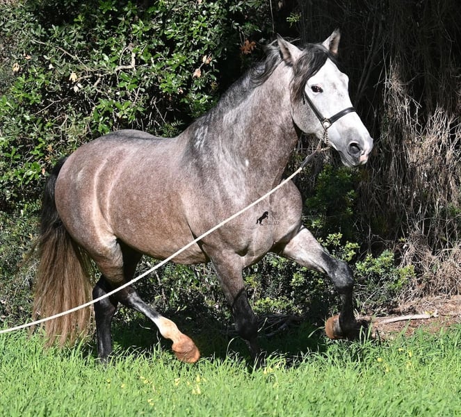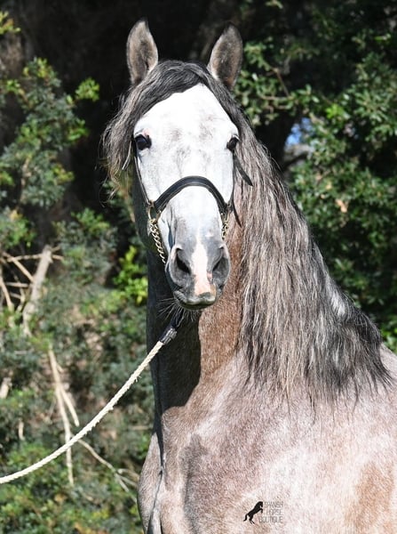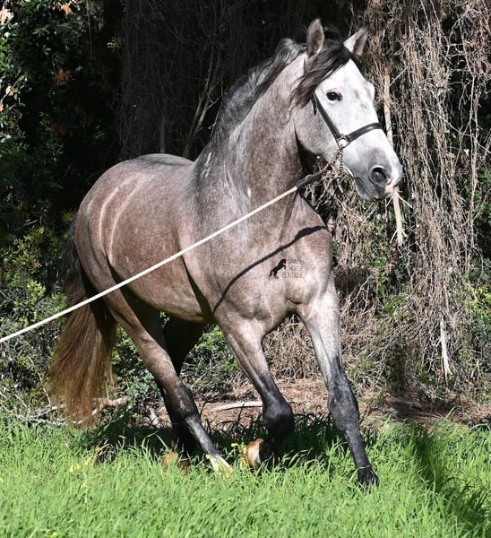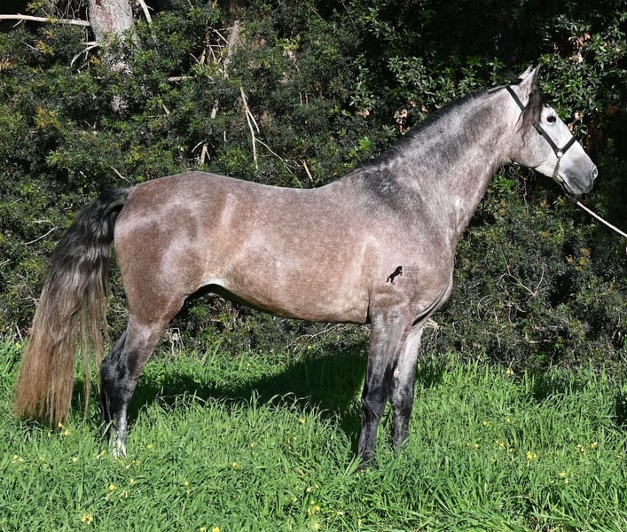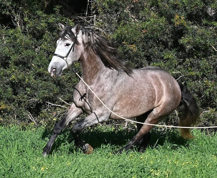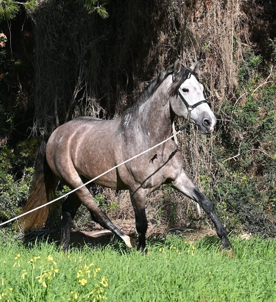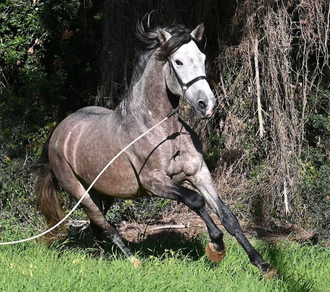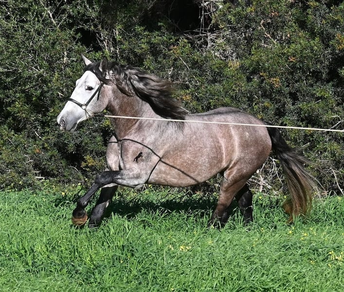 Dieser im Sommer 2021 geborene PRE Hengst (Andalusier mit Rassenachweis der ANCCE), ist jetzt schon ein bildschöner Bub und dass, obwohl er noch nicht voll entwickelt ist! Mit schon stattlichen 165cm, ist er schon eine eindrucksvolle Erscheinung und man braucht nicht viel Fantasie, wie er als Erwachsener aussehen wird (wird komplett Schimmel). Er ist absolut wohlerzogen im Umgang und stets mit einem Ohr bei seinem Menschen, um ja alles richtig zu machen und keinen falschen Schritt zu tun. Er wurde erst im Winter 2025 angeritten, denn große PREs brauchen Zeit zum Wachsen und die hat er bekommen. Das zahlt sich nun aus, denn er ist sehr lernwillig und arbeitet gerne, weil er nie überfordert wurde. Unterm Reiter hat er eine solide Basis wo auch laterale Lektionen wie Schulterherein begonnen wurden. Seine Gänge sind atemberaubend und geben ihm daher viel Potenzial für die Dressur. Da er aber auch sehr flexibel ist, wäre er auch ein guter Kandidat für die Working Equitation. Oder natürlich als liebes Freizeitpferd ;) Sein Schritt ist außerordentlich, der Trab lässt die Herzen höher schlagen und der Galopp hat eine gute Aufwärtskarenz. Er hat keine Hengstmanieren, könnte aber selbstverständlich vor Ort kastriert werden, sollte Hengsthaltung nicht möglich sein. Die Option auf weiteren Beritt vor Ort, ist ebenso gegeben. Wer ihn als Deckhengst einsetzen möchte, wird auch Freude haben, denn mütterlicherseits ist er ganz klassisch MONIS und YEGUADA MILITAR gezogen (Urlinien des PRE). Väterlicherseits finden wir sportliche Linien in der Abstammung und sogar einen MEJORANTE Hengst (Rasseverbesserer). Ein wunderschöner Bub, mit sehr guten Manieren und viel Potenzial zu einem fairen Preis für seine Qualität! Sein Standort ist Menorca. Videos und Abstammung gerne auf Anfrage. Gerne organisiere ich vor Ort eine AKU, Beritt, Kastration, Transport oder auch ihre Reise, sollten Sie persönlich zum Anschauen kommen. Details dazu gerne auf meiner Seite oder im Gespräch. Saludos aus Spanien