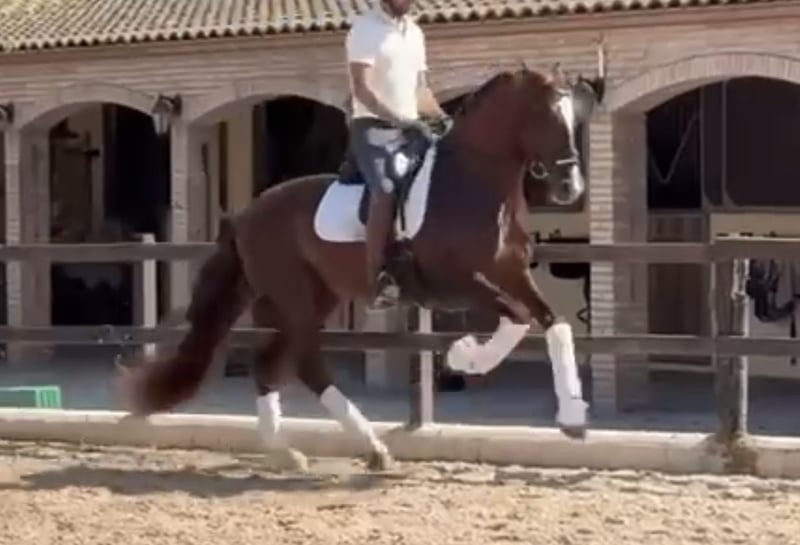 🇪🇸 VIOLINO 🇪🇸 🔥 Exceptional Chestnut PRE Stallion – 5 Years – 1.66 m – Grand Prix Prospect 🔥 For the discerning rider or investor seeking true quality, this is a rare opportunity to acquire a top-class Pure Spanish Horse with all the attributes to shine at the highest levels of dressage. Born in 2020, this striking chestnut stallion stands at 1.66 m and captivates with his elegance, presence, and naturally uphill frame. His conformation, movement, and exceptional trainability make him an ideal candidate for a future Grand Prix career. Currently working at the 5-year-old level, he is already showing a remarkable aptitude for collected work, including piaffe, to develop greater control, engagement, and preparation for advanced movements such as one-tempi changes. His work ethic, balance, and cadence set him apart from the ordinary. ✅ Age: 5 years ✅ Height: 1.66 m ✅ Colour: Chestnut ✅ Stallion – Pure Spanish Horse (PRE) ✅ Current Level: 5-year-old FEI level, schooling piaffe ✅ Health: 100% sound, full set of clean X-rays available ✅ Piroplasmosis free With his charismatic presence, exceptional movement, and proven soundness, this stallion represents not only a competitive prospect but also a valuable investment in the international dressage arena.