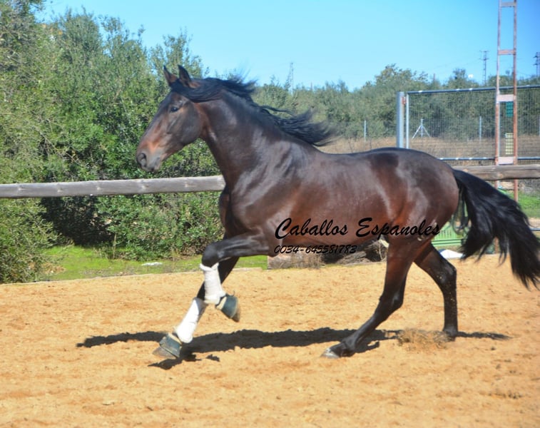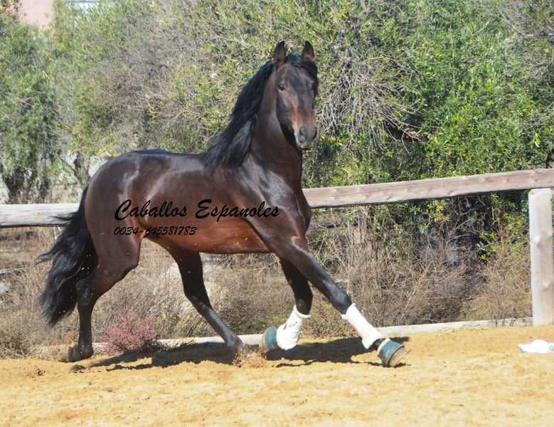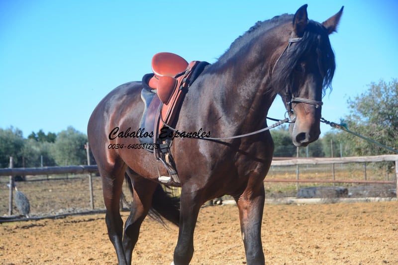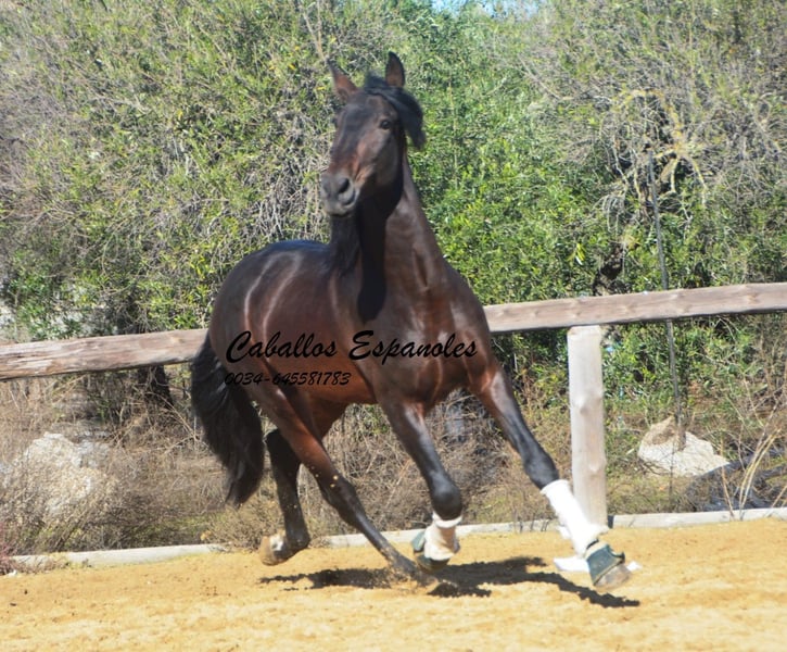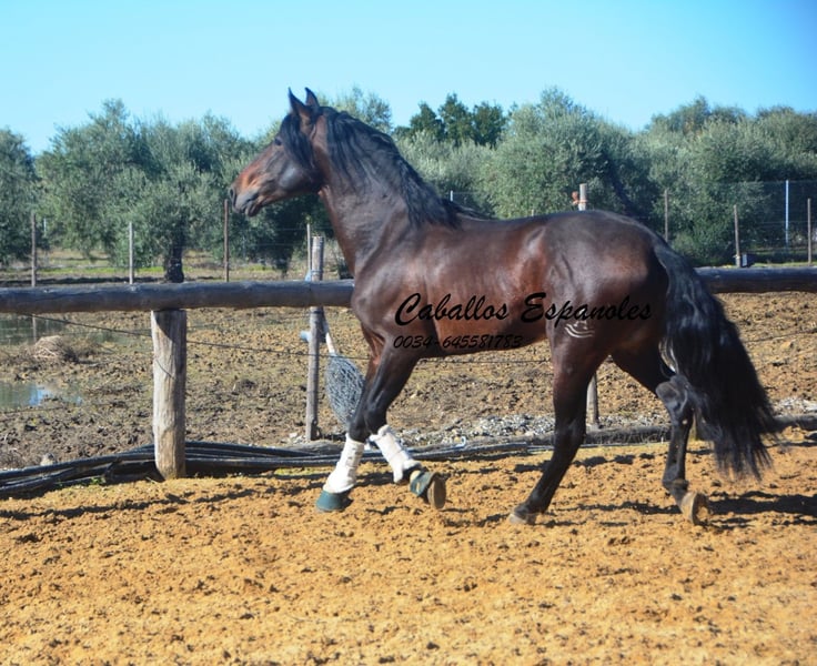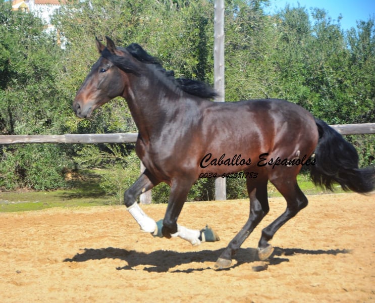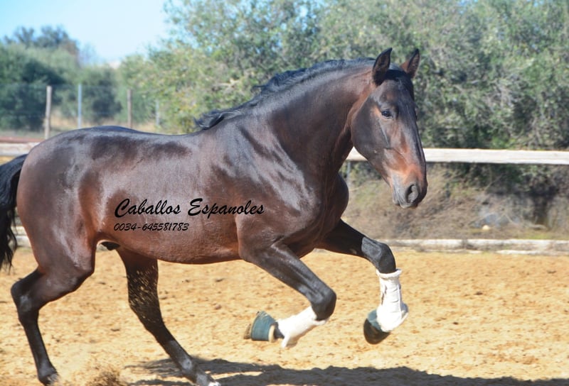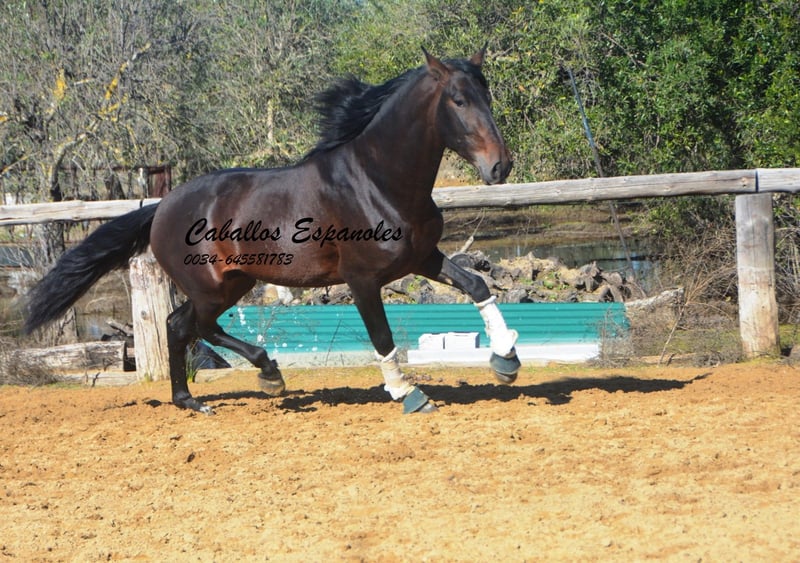 Este hermoso semental PRE de color marrón oscuro es de tamaño grande, muy parecido a su padre. Se encuentra sobre una estructura sólida, con una bonita línea dorsal y una crinada abundante. El joven ha sido montado en los tres aires básicos. Le gusta trabajar en el paddock y aprende rápidamente. También ha salido al campo, donde se muestra tranquilo y valiente. Un caballo excelente para el jinete de ocio ambicioso. El caballo se vende por encargo. Puede quedarse con nosotros en entrenamiento adicional si se desea. Se organizará una revisión veterinaria en breve. Transporte internacional disponible.