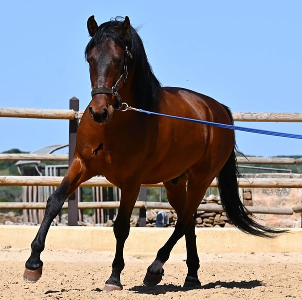 Dieser 2020 geborene, reinrassige PRE Hengst (Andalusier mit Rassenachweis der ANCCE), ist ein richtiges Powerpaket der nur so vor Elan bei der Arbeit strotzt! Er kommt von einem liebevollen Züchter, wo Spätentwickler wie die Spanier, das bekommen, was sie wirklich brauchen- Zeit! So ist er bis 3 in der Hengstherde komplett roh gestanden, wurde dann kurzzeitig aufgestallt, um die Basics zu lernen und dann wieder in den Urlaub entlassen, um alles mit Zeit zu verarbeiten. So hat er aktuell eine gute Basis unter dem Sattel, wo besonders darauf geachtet wird, dass er gut zu differenzieren lernt, zwischen seinem Vorwärtsdrang und Ruhephasen unter dem Reiter. Er lernt immer besser, sich selbst zu tragen, sich zu strecken und Ruhephasen zu verlängern, was sehr schön zu sehen ist. Ein Pferd, dass nicht in der Ausbildung gehetzt wurde, sondern sich erst finden darf und lernt die Energie zu lenken. Und Arbeitswillen hat er ohne Ende! Wo anderen schnell die Puste ausgeht, gibt er mehr und ist unermüdlich, womit er bestimmt ein Ideales Pferd für sehr ambitionierte Reiter ist, die gerne regelmäßig und gezielt trainieren. Geritten wird er auf doppelt gebrochener Wassertrense und ist nur an den Vorderhufen beschlagen. Nachts lebt er auf einem Hengstpaddock, was seinem Kopf auch sehr gut tut und tagsüber ist er in der Box für fürsorgliche Pflege und die korrekte Fütterung ist so besser garantiert. Ausritte auf dem hektargroßen Areal tun ihm auch gut und man merkt richtig, wie er da in seine Mitte findet, als positive Abwechslung zum Viereck. An leichten Arbeitstagen geht er in die Führmaschine und wird auch so weiter bemuskelt, ohne Gewicht zu tragen. In seiner Abstammung finden wir Ausnahmehengste wie YACO de TORRELUNA, ERMITAÑO III und sein Bruder ist sehr erfolgreich in der Dressur und hat es sogar zum SICAB (Weltmeisterschaft der PRE) geschafft. Er hat noch nicht gedeckt und kennt es, in der Nähe von Stuten zu sein, wobei die Option der Kastration vor Ort, selbstverständlich besteht. Aktuell misst er 157cm und hat ein schön barockes Exterieur, mit einem feinen Spanierkopf und guten Bewegungen, die ihn für viele Sparten mit hohem Arbeitsniveau interessant machen. Preiskategorie E! Sein Standort ist Menorca. Videos und Abstammung gerne auf Anfrage. Gerne organisiere ich vor Ort eine AKU, Beritt, Kastration, Transport oder auch ihre Reise, sollten Sie persönlich zum Anschauen kommen. Details dazu gerne auf meiner Seite oder im Gespräch. Saludos aus Spanien