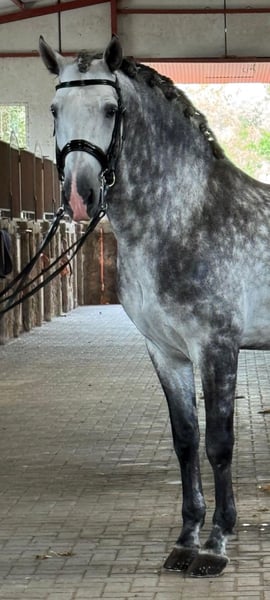 Magnificent 16.1 hh dapple gray gelding with an elegant presence and extraordinary nobility. This exceptional individual stands out for his classic beauty, harmonious movement, and exceptionally balanced temperament. He possesses an imposing presence, always attentive and eager to please. His noble and reliable temperament makes him an ideal partner for both dressage and leisure riding. He is respectful, gentle, and has a very good head, qualities that make him easy to handle even for less experienced riders. Additionally, he responds very well to aids, showing a willingness to learn and progress. Perfect for those seeking a horse with heart, elegance, and distinction. A true performer who captivates not only with his dapple gray coat but also with his noble soul and impeccable attitude at all times. The horse is available for all kinds of tests, demonstrating excellent behavior and aptitude in any environment. We speak English, German, and Spanish, and offer comprehensive assistance with transportation and logistical details, including free pickup at Alicante Airport.