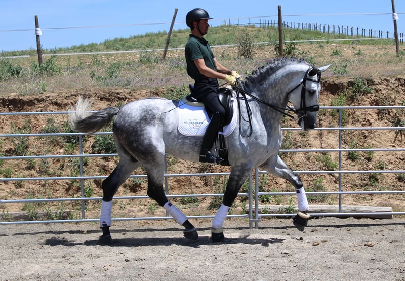 NL Stables NR Romerito has the complete package. He is very sweet, beautiful to look at, and has real talent for the sport. With a height of 1.75m, he is also very interesting for taller riders. He has a good walk, a spacious, workable trot, and a fantastic canter. He is trained at Z-level, knows all lateral movements, and performs a correct change on both sides. Romerito also has a lot of experience with trail riding and is familiar with all types of traffic. He would be great for a rider who wants to combine sport and recreation. Romerito was bred by the well-known breeder "Yeguada El Romerito." This breeder is known for his correct sport horses, with character and movement being a priority. His father comes from the famous breeder "Yeguada de Trujilo" and has produced several good sport and breeding horses. In the top line, you will find a lot of escalera blood. ✈️Romerito is located in Spain, 20 minutes from Madrid airport.