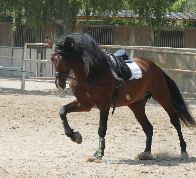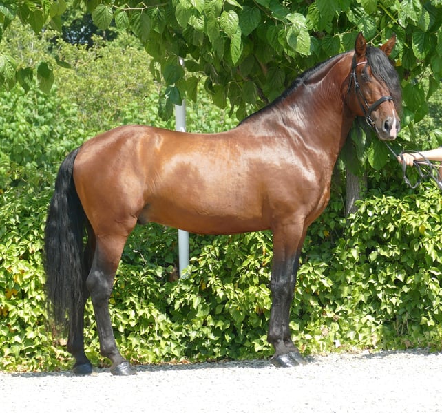 Papillon ist ein schöner PRE-Hengst. Er ist angenehm zu reiten und nicht schreckhaft. Er hat in seinem Leben nicht viel gearbeitet, daher ist sein Niveau in der Dressur grundlegend. Aber er lernt schnell. Er wird kastriert, um ein sehr angenehmes Pferd für jede Disziplin zu werden.