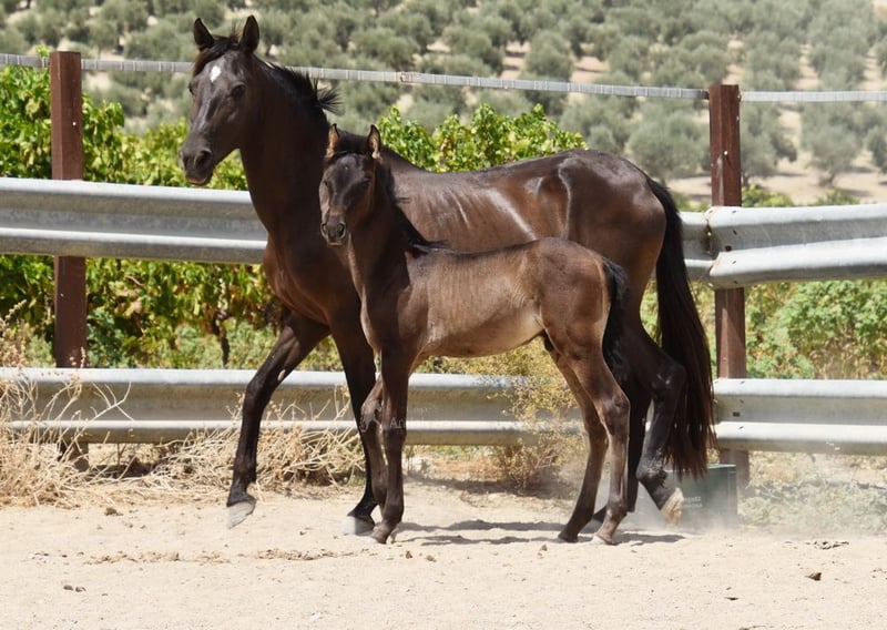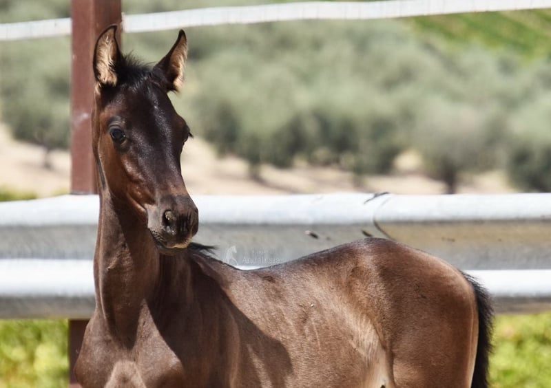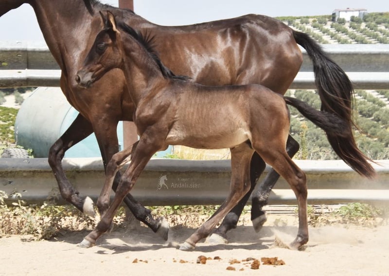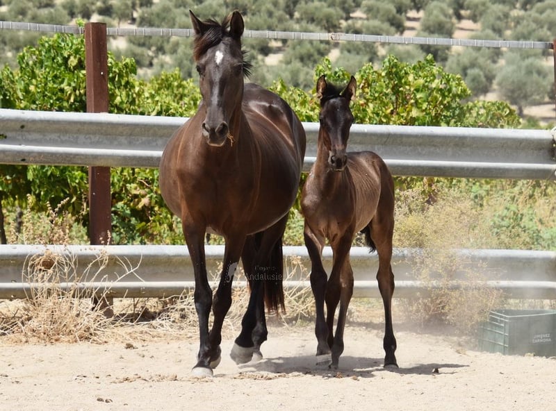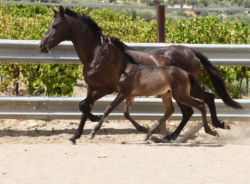 caractère doux, curieux, brut, se tient dehors avec sa mère et d'autres juments et poulains, grand, couleur spéciale, noir avec gène PRL, ascendance : Antonio Guiral Guarga, Hnos Pina, Señorio de Bariain, Bohorquez www.elegante-andalusier.com