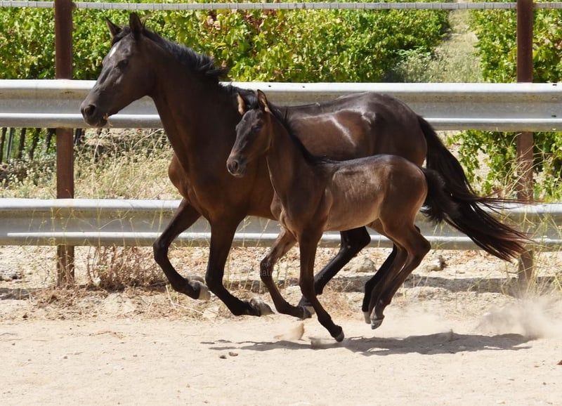 dear character, curious, untrained, stands outside with his mother and other mares and foals, large, special color, black with PRL gene, pedigree: Antonio Guiral Guarga, Hnos Pina, Señorio de Bariain, Bohorquez www.elegante-andalusier.com