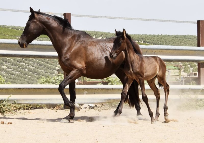 lieber Charakter, neugierig, roh, steht mit seiner Mutter und anderen Stuten und Fohlen draußen, groß, spezielle Farbe, Rappe mit PRL-Gen, Abstammung: Antonio Guiral Guarga, Hnos Pina, Señorio de Bariain, Bohorquez www.elegante-andalusier.com
