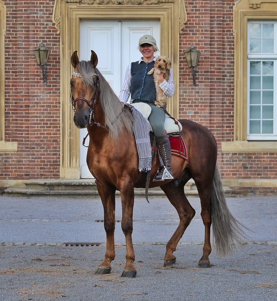 Pura Raza Española stallone da riproduzione Estudioso de Viñuela Tutte le informazioni importanti le trovate sul suo sito web o su Facebook: https://estudioso-de-vinuela.jimdosite.com Per tutte le razze di cavalli! Estudioso de Viñuela Attualmente disponibile per SEME FRESCO 2025* in tutta l'UE / in modo molto semplice. Da agosto in monta naturale per un numero limitato di fattrici. _ Stallone PRE | sooty Palomino con gene crema e omozigote nd1 (Pseudo Dun). - 1.64 e 6 anni. • Registrato ANCCE, Zfdp e Azteka. Autorizzato per razze estere* Estudioso de Viñuela è STATO APPROVATO dall'ANCCE. I suoi puledri fino ad ora si distinguono per il loro aspetto, dimensioni, fascino e colore. Estudioso è una vera rarità ed è l'UNICO stallone PRE disponibile in Germania con questo colore speciale! È esente da malattie ereditarie come PSSM, HERDA, GBED, HYPP, IMM, MH e WFFS. È omozigote nd1 (Pseudo Dun) e trasmette questa particolare colorazione a tutti i suoi puledri al 100%! Estudioso attira tutti gli sguardi. Con il suo manto che brilla di oro e rame e la sua criniera grigia, non lascia desideri insoddisfatti come colore speciale. Ma non è solo il colore del suo manto a entusiasmare. Estudioso porta con sé tre andature di base straordinariamente ampie, un carattere forte e impavido e una buona volontà al lavoro. Questo gli consente di affrontare facilmente le alte lezioni della dressage. Il suo carattere è impeccabile e già in giovane età si mostra volenteroso, affettuoso verso l'uomo e con nervi saldi. Ha un'ottima AKU con radiografie e nessun difetto fisico. Ottima valutazione della conformazione durante l'approvazione. Posizione: NRW (Germania)