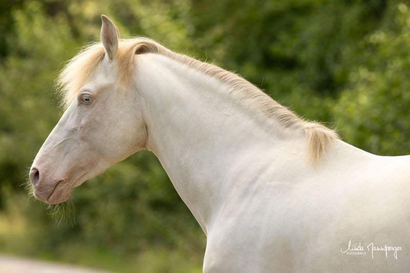 Curro Torreluna steht dieses Jahr Fremdstuten zum Decken an der Hand zur Verfügung. Curro unser kleiner Charmeur und Prinz hat die wunderschöne Farbe Perlino. Eine mega dicke und inzwischen deutlich längere Mähne. Die Bilder sind noch von letztem Jahr wo er zu uns aus Spanien kam. Sobald das Frühjahr da ist, werden wir neue aktuelle Fotos von ihm machen. Curro ist der perfekte PRE. Quadratisch, mega Hals und toller Hengstkopf, mega Behang, sowohl Mähne als auch Schweif, stabile Hufe. Er kann sich unglaublich toll versammeln, steigen ist für eine Kleinigkeit, selbst die Capriole vollführt er mal eben in seiner Box, wenn er sich besonders freut, weil die Stuten über die Koppel fetzen. Eigentlich kann ein Pferd entweder gut steigen oder die Capriole, Curro fällt beides extrem leicht.. Letztes Jahr haben wir dann auch feststellen müssen, dass er auch mit Springen aus dem Stand über 1,60m hohe Panels kein Problem hat und das bei einer Körpergröße von 1,58.. Eigentlich eignen sich PRE nicht so sehr fürs Spingen, aber bei Curro ist auch das etwas anders als normal.. Sein Charakter ist ein Traum. Ein mega Schmusebär, super lieb und anständig. Auch beim Decken an der Hand ein Schatz. Mit anderen Hengsten neben sich in der Box völlig entspannt. Auf Neues reagiert er gelassen. Im Gelände ist er auch anständig. Absolut klar im Kopf. Lernt aber super leicht. Ein wahre Freude! Zudem ist er komplett durchgeröngt worden, kein Befund. Wer sich also ein liebes, schmusiges, vielseitig veranlagtes Fohlen, mit toller Mähne wünscht in besonderer Farbe ist bei Curro genau richtig.