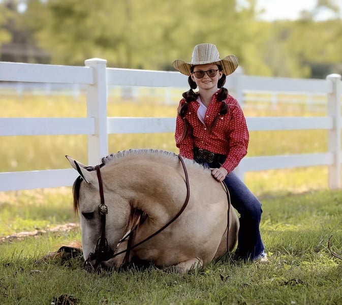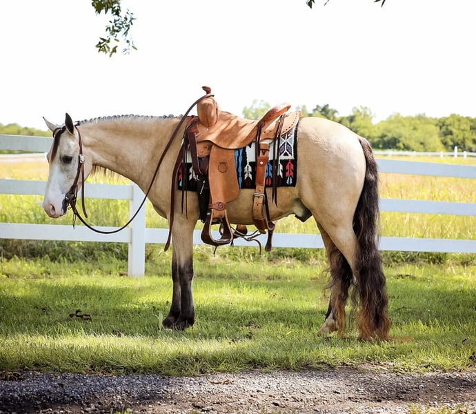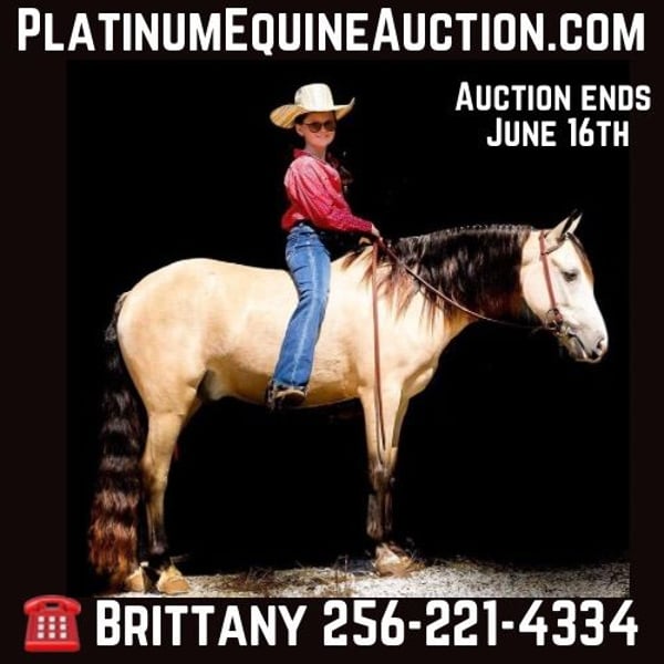 ONLINE AUCTION Place your bids at www.PlatinumEquineAuction.com Starting Bid $3500 Auction ends June 16th, 2024 Need a new saddle? Check out White Rock Saddles on our website or Facebook! William is a 5 year old gelding pony! That’s stands 13HH! With an amazing personality! He is willing to do anything u want and is supper smooth and easy going he is the right size for a kid and an adult! He was started by the Amish and rode to school ever day. He lays down on command! We have used him to pen cattle in the pasture and in the sale barn we have used him to snag calfs to take to the branding pit ! He is a pony u can hop on and do anything with ! He is a in your pocket type of pony ! Go to the gate call his name and he will come running ! There is not one bad thing I can say about this pony he is the right color (Buckskin ) ! With an amazing thick tail that drags the ground ! If u are looking for a pony that is bomb proof that rides like a big horse with a big stop and one step lope ! He is your pony! Contact Brittany 256-221-4334 with any questions. Located in Mt. Hope, AL. ONLINE AUCTION Place your bids at www.PlatinumEquineAuction.com Starting Bid $3500 Auction ends June 16th, 2024 Need a new saddle? Check out White Rock Saddles on our website or Facebook!