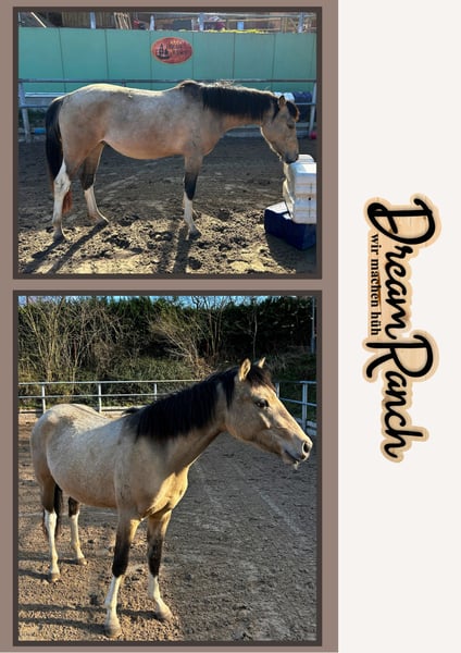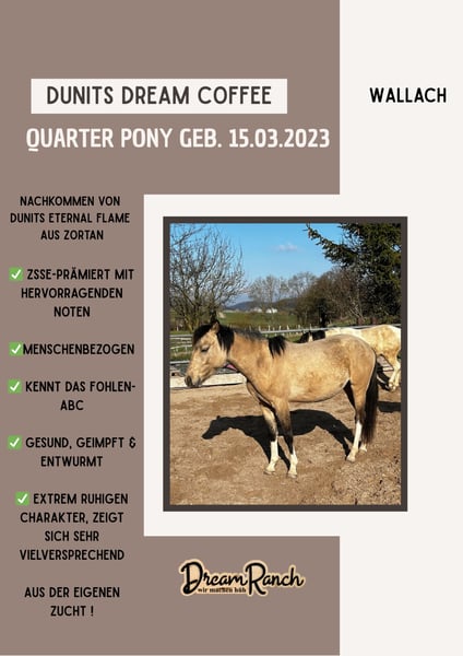 Geboren am 15.03.2023 - Hengstfohlen - Quarter Pony Coffee ist ein Nachkommen von Dunits Elternal Flame (American Quarter Horse) aus Zortan (Reitpony mix) Er ist am 10.09.2023 bei der Zsse Prämiert, mit den Wertnoten: Typ: 8,0 Gebäude: 8,0 Korrektheit 8,5 Trab: 8,0 Gesamt Eindruck: 8,1 Er ist Entwurmt, Geimpft, Kennt das Fohlen Abc ist freundlich im Umgang, gelassen, neugierig und lernwillig.