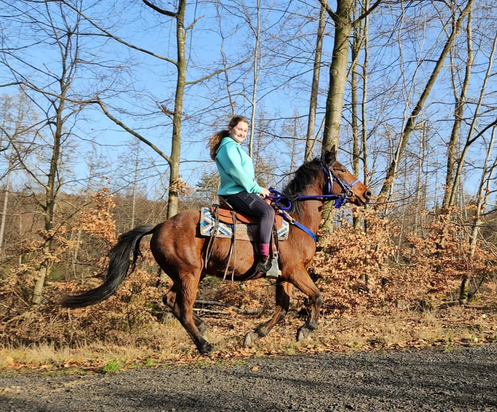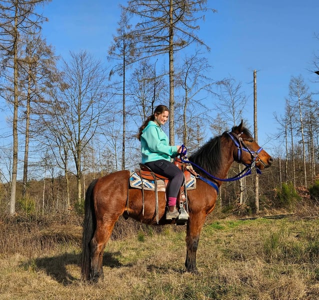 Quarter-Mix-Wallach „Shorty“ – jung, menschenbezogen - Traumhaftes Familienpony Eckdaten: • Name: Shorty • Rasse: Quarter-Mix • Geschlecht: Wallach • Alter: 4 Jahre • Stockmaß: ca. 1,46 m • Ausbildungsstand: angeritten • Preis: 5900,- Zum Verkauf steht dieser charmanter Quarter-Mix-Wallach „Shorty“ ein junger, talentierter Wallach mit bestem Charakter und einem offenen, menschenbezogenen Wesen. 🐴 Shorty ist: – super menschenbezogen und freundlich im Umgang – brav, neugierig und sehr lernfreudig – ruhig und gelassen – kennt Kinder, Landmaschinen und das Hofleben – beim Anreiten kooperativ, motiviert und konzentriert bei der Sache – bleibt auch in neuen Situationen cool und aufmerksam – sucht einen Menschen, der Freude daran hat, ihn weiter zu fördern und gemeinsam mit ihm zu wachsen Mit seiner ausgeglichenen, vertrauensvollen Art und seinem klaren Kopf bringt Shorty beste Voraussetzungen mit, um sich zu einem verlässlichen Freizeitpartner zu entwickeln – ob für Western-, Freizeit- oder Bodenarbeit. 🐎 Perfekt für: Reiter mit Gefühl und Geduld, die Spaß daran haben, ein junges Pferd weiter auszubilden und eine echte Partnerschaft aufzubauen. Unsere Pferde: – regelmäßig entwurmt – vom Schmied & Osteopathen betreut 🛍 Hofladen: Westernsättel, Trensen, Zubehör 🚛 Transport & Zubehör auf Wunsch günstig organisiert ✅ Unser Service: – 3 Monate Umtauschrecht – Proberitt: 35 €, jedes weitere Pferd 25 € (beim Kauf am selben Tag angerechnet) – 100 € Sofort-Rabatt bei Abholung/Transport am selben Tag – Persönliche & ehrliche Beratung 📞 Anfragen bitte nur telefonisch: 0171 – 4001968 🕗 Täglich erreichbar: 8–20 Uhr ⚠️ Keine E-Mail oder WhatsApp ⚠️ Alle Angaben ohne Gewäh9