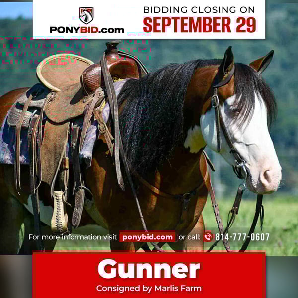 🐴 𝒕𝒉𝒆 𝐅𝐀𝐋𝐋 ℙ𝕆ℕ𝕐 𝑺𝒑𝒆𝒄𝒕𝒂𝒄𝒖𝒍𝒂𝒓🐴 Happening now thru MONDAY | SEPTEMBER 29th - Available EXCLUSIVELY on Ponybid's website! For more details and to register visit: www.Ponybid.com CONSIGNOR CONTACT: Marlis Farm 814-777-0607 LOCATION: Rebersburg, PA BREED: Quarter pony REGISTERED: No COLOR: Bay paint HEIGHT: 12.3 AGE: 5 GENDER: Gelding Let me introduce you to the coolest, brokest pony you will ever meet, “GUNNER”, is a 5 year old 12.3hh gelding with all the class, all the talent and all the beauty you could ever dream of! This superstar of a pony doesn’t miss a beat! He is the kind you can feel safe with your kids and trust that he will take care of them in any environment; around the farm, in the arena, out on the trails and everywhere in between! Gunner is the fanciest pony under English tack! He moves like a hunter and jumps to perfection! He would make a fantastic show pony! He has a lovely walk, trot, canter - he picks up both leads and has good brakes! Gunner is happy to pack around beginners and teach them the ropes, he is overall an easy ride and a kids best friend! Outside of the arena Gunner is a safe, trustworthy and solid trail partner! The kids ride him all over the farm, in the cow pasture, down the road, through the woods, in the water - you name it! This pony is unbothered by his surroundings and takes care of his rider every step of the way! If riding isn’t your style - no problem! Gunner also drives the best! He stands good to be harnessed and drives wherever you point him! He is safe enough for beginners and children to drive and always stays calm and collected even in the busiest traffic! In the barn, Gunner is so sweet and loving. He adores attention and will stand all day long to be groomed and doted on. The kids run around and climb all over him and he always stands without a complaint - he’s just happy to be here. He is an easy keeper, no vices or maintenance. Gunner is very laid back, he can be the only one in the barn and you’ll never hear a peep out of him or he can be turned out in a mixed herd and gets along with everyone! The kids can pull him out of the field, bring him in, groom him, bathe him, tack him up without any help! He is just that easy. Gunner is a pleasure to be around him and our kids love playing with him, but he is ready to make his next child’s dreams come true! Gunner is truly that very special, saintly, once in a lifetime pony that so many people are after, but few will find. If you think he is the one for you, please do not hesitate to reach out! Gunner deserves the BEST home where he will be loved and spoiled by his own little human!