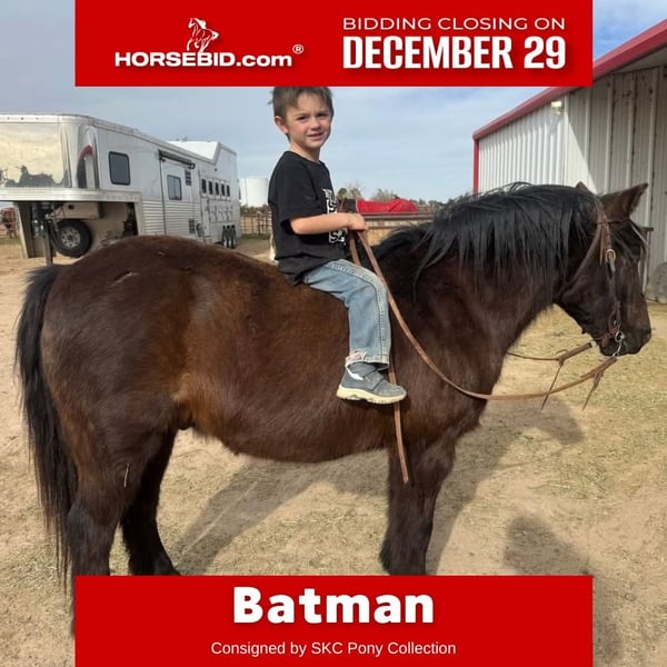 ⚜️ 𝓗𝓮𝓻𝓲𝓽𝓪𝓰𝓮 𝐖𝐢𝐧𝐭𝐞𝐫 𝓒𝓵𝓪𝓼𝓼𝓲𝓬⚜️ Happening now thru MONDAY | DECEMBER 29th - Available EXCLUSIVELY on HorseBid's website! For more details and to register visit: www.Horsebid.com CONSIGNOR CONTACT: SKC Pony Collection 806-282-7093 LOCATION: Canyon TX BREED: Quarter pony REGISTERED: No COLOR: Black HEIGHT: AGE: 8 GENDER: Gelding This super cute black pony is an absolute babysitter and without question one of the best ponies we’ve ever owned. He is as pure and gentle as they come, with the kind of kindhearted nature that makes parents feel completely at ease and kids instantly fall in love. Any little kid in the world can catch him, groom him, and ride him safely. He is quiet, patient, and forgiving, whether they’re riding bareback, crawling all over him, or heading out on their own little adventure. This pony truly takes care of his rider and never takes advantage. He’s been used for gathering cattle, confidently goes anywhere you point him, and handles all the little play-day events with ease. He’s the kind of pony you can just walk up to, climb on, and go — no fuss, no worry. To top it off, he drives as well, making him even more fun and versatile. From the arena to the pasture, from lead-line beginners to confident little riders, this pony does it all with a quiet mind and a gentle heart. Simply put, this is a once-in-a-lifetime babysitter pony — safe, honest, and irreplaceable