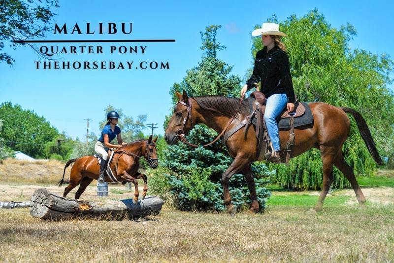 OPEN BIDDING ON THEHORSEBAY,COM. SALE ENDS ON 08/20 @ 3:40PM CT. More information is available on the website, including an UTD vet inspection, Coggins, video, images, and the owner's contact information to ask questions, request information, or make arrangements to come to visit. Malibu is a 5-year-old liver chestnut Quarter pony! Malibu stands at 13 hands and is as built as solid as they come! Malibu is extremely versatile and has been ridden in lots of different terrains and situations! I have ridden Malibu to our local coffee shop and lunch place with lots of dogs, strollers, runners and traffic! Including semis and loud trailers/trucks. My little sister has also taken her up into the mountains and done lots of steep and rough terrain with her; she’s great at making or finding a trail and will go over or through anything you point her at. Malibu is sure-footed and has been barefoot her whole life. Malibu has the start of some English as well and has not ever refused a jump, she makes an extremely cute hunter jumper. Malibu has also gone through the gymkhana patterns and is athletic enough to become very competitive at them consistently. Malibu is an all-around impressive and talented mare with a lot of athleticism and grit! Take her any direction you want, she will excel!! Malibu is as bombproof as they come when you’re on her and we’ve even hauled around flags and tarps on her but can be very nervous and stand offish when she first meets you, she’s very loyal and sweet once she gets to know you. And will be best with someone with a quiet and loving hand. Malibu can be nervous to be caught but will face you and, if you click, will walk right up; video at the end explaining!