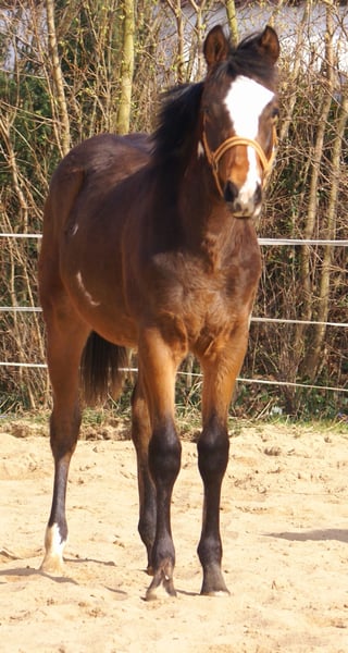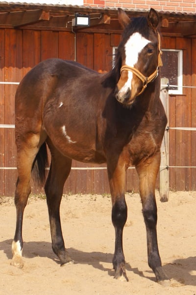 Splendido puledro stallone Quarter Pony, di colore marrone scuro con macchie, padre: Paint Horse Kingsley n Jills Wood, madre: Pony tedesco da dressage di Kennedy WE. Possiede tutta la documentazione completa, passaporto ZSSE. È un dolce e socievole cuoricino con una marcata macchia bianca sulla fronte, testa elegante e un segno a forma di cuore sul collo. Dotato di movimenti leggeri, ampi, eleganti e agili, ideale per il dressage. Proveniente da madre pony tedesco da dressage.