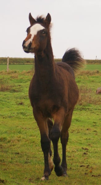Charming Quarter Pony colt, dark bay with spots, sire: Paint Horse Kingsley n Jills Wood, dam: German Riding Pony by Kennedy WE. The foal comes with full papers and a passport from ZSSE. Raised alongside other foals, this friendly little heartbreaker features a distinctive blaze and a heart-shaped mark on its neck. Light-footed with expressive, large movements.