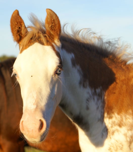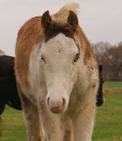 In auffälliger chestnut overo Optik präsentiert sich dieses Hengstfohlen mit 2 blauen Augen, Vater: Paint, Mutter: Deutsches Reitpony, das Fohlen hat volle Papiere, wüchsig, fröhlich, besonders