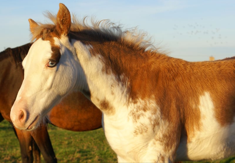 This colt stands out with its striking chestnut overo coloration and features two blue eyes. Sired by a Paint stallion and out of a German Riding Pony mare, the foal comes with full papers. It is well-grown, cheerful, and truly exceptional.