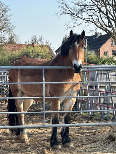 Aus familiären, belastenden Gründen muss ich mich schweren Herzens von meinem sportlichen Kaltblut trennen. -wallach -6 Jahre alt -1.68 groß -sportlich -kuschelbär Artos musste leider schon den ein oder anderen Umzug/Besitzwechsel mitmachen und ist bei mir selbst erst 3 Monate Zuhause (weshalb ich ihn wieder abgebe, können wir gern privat besprechen). Er ist eine wirklich reine Seele und macht unglaublich viel Freude. Er hat Spaß an der Arbeit und ist immer stets motiviert. Er wird Dressurmäßig gearbeitet, im springen nicht weiter gefördert, er zieht gut an, ist jedoch wohl kein Springpferd *lach*. Ein kleines Kreuz oder einen kleinen Steil, haben wir aber schon gemeistert. Im Gelände benötigt er einen erfahrenen und ihm Sicherheit vermittelnden Reiter, weil er manchmal ein kleiner Schisser ist. Er macht das jedoch mit 2. Pferd sehr souverän und wird auch nicht blöd dabei. Das ist eine Sache des Trainings und der Gewohnheit. Macht aber keinen Unsinn und wird auch nicht Kopflos. Er bereitet mir sehr viel Freude und ich hänge wirklich mit viel Herz an ihm. Er lernt schnell und ist vom reiterlichen Gefühl her auch nicht sehr massiv. Gern berichte ich persönlich noch einmal mehr von ihm oder schicke Videos oder Fotos rüber. Zubehör könnte er gegen Aufpreis mit bekommen. Er hat einen WOW Sattel. Er kennt und sollte bestenfalls in Offenstallhaltung und viel Bewegung und Spielkumpels zur Verfügung haben. Er ist nicht extrem ranghoch, aber definitiv auch nicht rangniedrig.