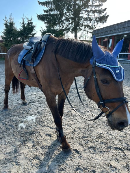 Nelson, Ist ein super lieber Wallach der viel Erfahrung mit sich bringt und ganz artig seinen Job macht. Er ist leicht an den Zügel zu reiten, steht gut an den Hilfen und springt sehr gerne. Er gehört aber eher zur gediegenen Sorte und lässt sich ungern aus der Ruhe bringen. Er springt sehr zuverlässig und macht super fliegende Wechsel von alleine. Er geht sehr gerne ins Gelände und ist da auch motiviert unterwegs. Er kennt Ausbinder und geht sowohl mit einem Dressursattel als auch Springsattel sehr gut. Ein super Pferd, um in den Sport einzusteigen bzw. auch ein gutes Wiedereinsteiger Pferd. Er lässt sich auch ohne Sattel reiten und Longenunterricht kennt er auch. Er hat letztes Jahr einige Turniere mit unseren Reitschülern bestritten und auch einige jugendliche durchs Abzeichen getragen. Er ist super fit und war bei uns nie lahm. Vorne braucht er 2 Eisen. Früher war er auf dem Turnier bis L springen platziert. Schmiede- und Verladefromm. Weitere Vidoes auf Anfrage