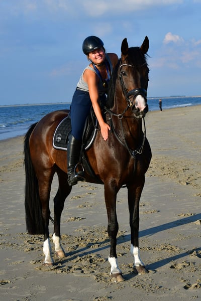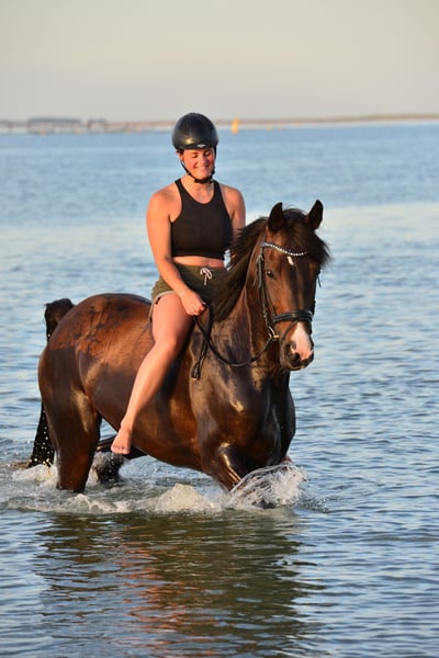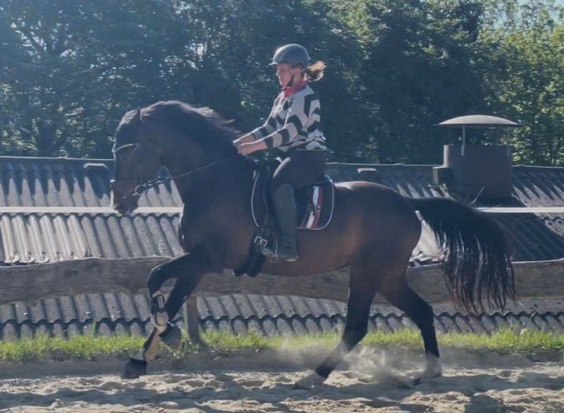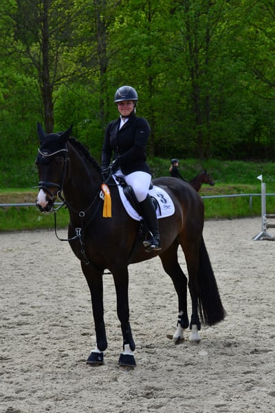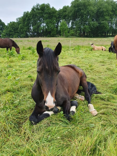 An elegant Rhineland mare, born in 2012, is available for sale. Standing at 16.1 hh with expressive gaits, she presents herself as a striking dressage partner. Rapunzel has training up to L-level and is eager to learn in dressage, showing potential for further development in the right hands. She has achieved success in dressage (A-level winner, WN 7.6) and show jumping; however, loud music and applause have made her nervous, and she currently appears tense in the arena. To achieve further competition success, time and effort should be invested in outdoor training under competitive conditions to improve her calmness. Without the stress of competitions, she performs reliably in the riding arena or indoor riding hall and is farrier- and loading-friendly. In the field, she is confident and fearless, always manageable, making her absolutely suitable for beginners. Due to her calm and dependable nature, she would be well-suited for late starters or re-entrants who wish to pursue high-level dressage. We are particularly eager to find a new owner or family who will cherish her.