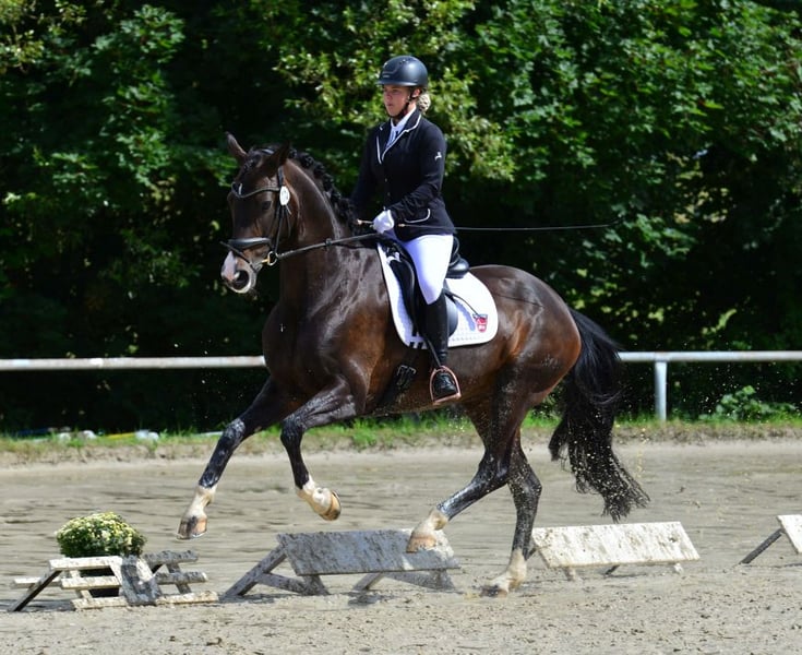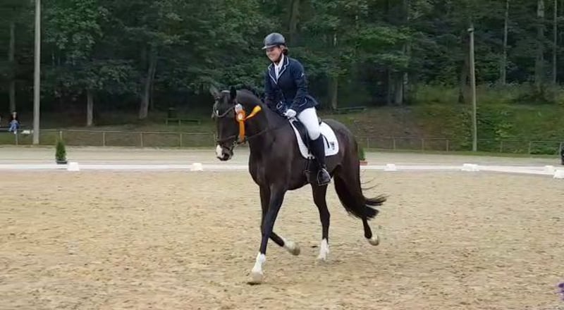 Zum Verkauf steht eine elegante, rheinländische Stute, geboren im Jahr 2012. Mit einem Stockmaß von 167 cm und schwungvollen Gangarten präsentiert sie sich als ausdrucksstarke Dressurpartnerin. Rapunzel verfügt über eine Ausbildung bis L-Niveau und zeigt sich lernwillig in der Dressurarbeit, so dass sie in den richtigen Händen weiter gefördert werden kann. Sie hatte Erfolge in Dressur (A gewonnen, WN 7,6) und Springen, allerdings haben sie laute Musik und der Beifall der Zuschauer nervös gemacht und sie präsentiert sich heute im Viereck unentspannt. Für weitere Turniererfolge müsste Zeit in Auswärtstrainings unter Turnierbedingungen investiert werden, um an ihrer Gelassenheit zu arbeiten. Ohne Turniertrubel macht sie einen zuverlässigen Job auf dem Reitplatz oder in der Reithallte und sie ist schmiede- und verladefromm. Im Gelände ist sie sicher und unerschrocken, bleibt immer händelbar und ist damit absolut anfängergeeignet. Aufgrund ihres braven, verlässlichen Charakters wäre sie gut für Spät- oder Wiedereinsteiger geeignet, die auf gehobenem Niveau Dressur reiten wollen. Bevorzugt möchten wir eine solche neue BesitzerIn oder -familie für sie finden.
