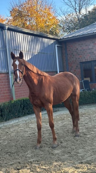 Zum Verkauf steht diese 3jährige Stute aus züchterhand. Ella, wie sie bei uns im Stall genannt wird, stammt ab vom 1.50m erfolgreichen Hengst Comme le Coeur (https://www.horsetelex.de/horses/pedigree/2036551/comme-le-coeur) Die Mutter von Cassini brachte bereits einen in Hannover gekörten Sohn, der auch sportlich altersgemäß erfolgreich war (Sieger Quali Bu Cha) bis zu seinem Vekauf nach Canada. Ella befindet sich zur Zeit auf dem Weg zum Einreiten, seit 3 Wochen aufgestallt. Sie ist altersentsprechend lieb im Umgang und kennt bisher : Longieren mit Sattel& Ausbinder, sowie Freispringen. Sie ist mit dem nötigen Go eines Sportpferdes ausgestattet und zeigt viel Qualität am Sprung. - Neue Röntgenbilder können zu 50% vom Verkäufer übernommen werden - bei Kauf kann die Stute bis Mitte Dezember bei uns weiter gearbeitet werden - Standort 47652