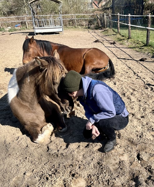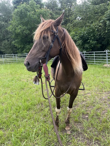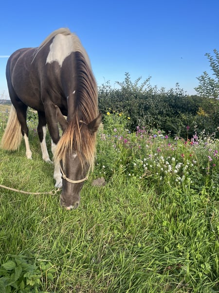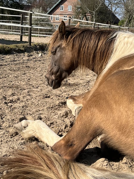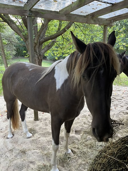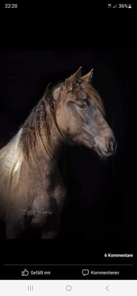 Beautiful and large Rocky mare for sale. She is registered as a Spotted Mountain Horse due to her special color. She is an absolute treasure. I can very well imagine her as a therapy horse after appropriate training. At the moment, she is still playful, as befits her age. She has been regularly dewormed, vaccinated, had her teeth done, treated osteopathically, and she is barefoot. She also loads onto the trailer without any problems. In 2023, she was with Cary Hardiman for 5 months for basic training (Western). Since then, we have mainly been out in the field and have done a lot of groundwork. She is very soft in the mouth, can be ridden well without a bit, and is incredibly comfortable to ride. I will only let her go to the very best hands. She is not used to box confinement and should therefore continue to be kept in an open stable with at least two other horses. This is not an urgent sale. A Deuber Jerez SKL (Bückeburger model) in size S2, specially fitted for her, can be purchased separately if interested. Also, a Spanish bridle. Both in black. Please write if interested.