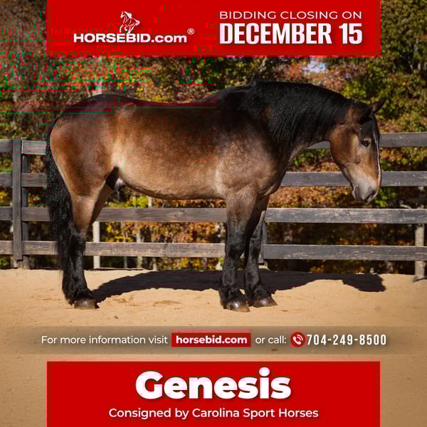 🎄𝐓𝐇𝐄 𝑯𝒐𝒍𝒊𝒅𝒂𝒚 𝐂𝐋𝐀𝐒𝐒𝐈𝐂🎄 Happening now thru MONDAY | DECEMBER 15th - Available EXCLUSIVELY on HorseBid's website! For more details and to register visit: www.Horsebid.com CONSIGNOR CONTACT: Carolina Sport Horses 704-249-8500 LOCATION: Clover SC BREED: Selle Francais x Trakehner x QH REGISTERED: No COLOR: Buckskin HEIGHT: 16.1-2 AGE: 6 GENDER: Gelding Genesis is one of the most breathtaking horses we’ve ever offered—an undeniable work of art with the presence, build, and elegance that stop people in their tracks. His beauty is matched only by his temperament: calm, reliable, and wonderfully safe for riders of all ages. He’s the rare horse that gives confidence to beginners yet still offers the talent and feel that experienced riders truly appreciate. Under saddle, Genesis is a joy. He loves to flat in the arena with soft, balanced gaits and a steady rhythm that riders instantly connect with. Outside the ring, he shines just as brightly—brave, thoughtful, and honest on cross-country, trails, and any new adventure you send him on. His size and strength make him a fantastic candidate for fox hunting, working equitation, hilltopping, family trail rides, and all-around fun. In the barn, Genesis is pure sweetness. He is loving, kind, and deeply connected to the people around him. He thrives when he has a person or family to bond with—someone he trusts, follows, and wants to please. He is the horse who quietly becomes “your” horse, greeting you at the stall, enjoying grooming, and always trying to be the best partner he can be. If you’ve been searching for the perfect blend of beauty, safety, personality, and versatility, Genesis checks every box. He’s the family horse everyone hopes to find—stunning, dependable, affectionate, and endlessly enjoyable in every setting.