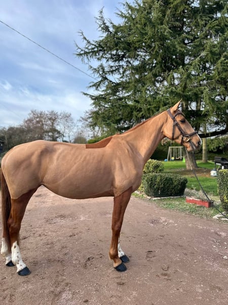 Lithuanie des perriers – selle français – 5 ans – alezane – Toise 162 cm. Par Ulyss morinda X C Indoctro C’est une jument avec de vrais moyens pour le CSO. Actuellement prête sur un petit parcours, elle se montre particulièrement franche et démontre un top respect de la barre. Très prometteuse, elle va être très concours et saura ravir son futur cavalier par son envie de bien faire. Extérieur : Sort seule ou accompagnée, elle est sereine en balade. Soins : Très facile au quotidien (tonte, transport, maréchal, marcheur). Mode de vie : Actuellement en boxe avec sorties quotidiennes au paddock avec des congénères. Santé : À jour de tout (vaccins, dentiste, ostéopathe).