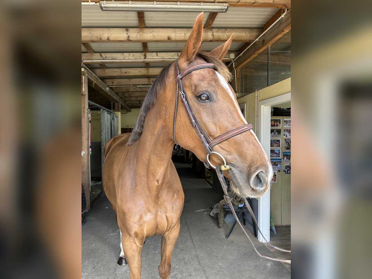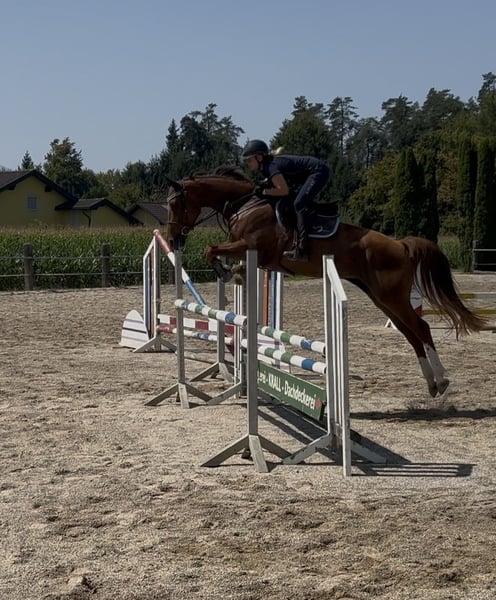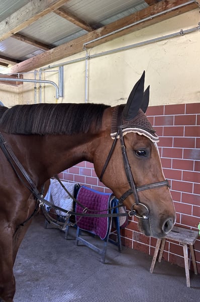 For sale is a beautiful Selle Français mare due to lack of time. This elegant and well-trained Selle Français mare was born in 2018. She is a dark chestnut with a height of 16.1 hh and impresses with her friendly temperament and elegance. This horse is ideally suited for advanced recreational riding. She has already been successfully competed in show jumping (up to 1 meter). Thanks to her versatility, she is perfect for ambitious hobby riders. She demonstrates a balanced and reliable nature, is well-trained, and has a pleasant fundamental attitude. I acquired her directly from the breeder in France at the age of 2, she had a foal with me, and was gently backed and trained. For any further information, please feel free to contact me. Viewing and trial riding are possible by appointment.