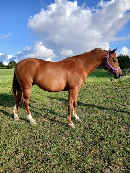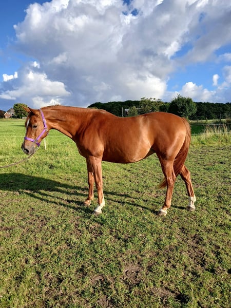 Daria est une jument très sensible qui ne sera confiée qu'à des mains très expérimentées et de la meilleure qualité. Elle a été montée pour la première fois à l'âge de 5 ans, mais n'a pas été poursuivie en raison de mes difficultés de temps. Elle a eu un poulain femelle il y a 2 ans et est enregistrée comme jument primée au VZAP. Malheureusement, elle n'est pas redevenue pleine depuis. Elle a besoin d'une personne en qui elle peut avoir confiance. C'est une jument très amicale et prudente, qui est très attachée et aime l'affection.