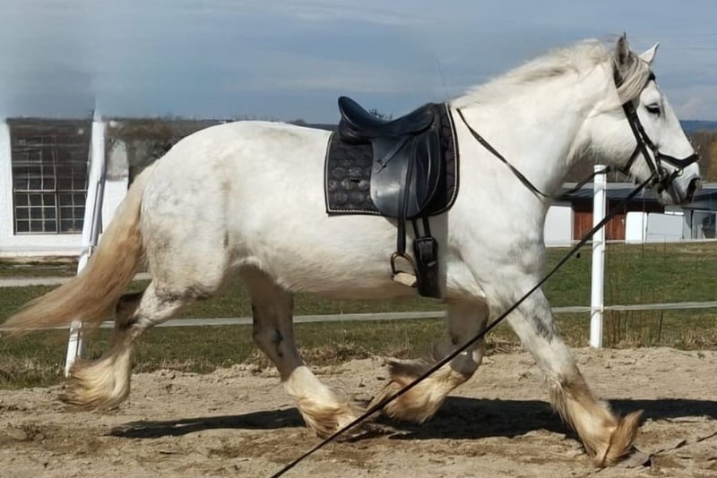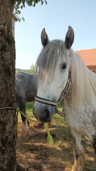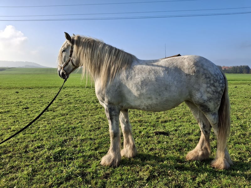 Thank you for your interest in our Shire Horse mare, Twinkle. Twinkle was born in 2019 and currently stands at approximately 1.75 m, although she is still growing. She has full papers from the English Shire Horse Society. She comes from our breeding program and has been raised from the beginning with other foals and later in a mixed herd. Both her parents impress with their balanced and friendly character. Twinkle has grown up in a herd environment and is familiar with both 24/7 outdoor living and stable life. She currently lives in an open stable but is also accustomed to a box. In the group, she is rather high-ranking but also enjoys mutual grooming with her horse friends. Now that she is 5 years old, we have started her training under saddle. Twinkle impresses with her quick comprehension and calm demeanor. If she doesn't understand something, she stands still instead of getting nervous. She is people-oriented and curious. All our horses are gently started under saddle from the age of 5. Until then, we focus on basic obedience, groundwork, and desensitization training. Working with Twinkle is particularly enjoyable due to her motivation and enthusiasm. Of course, she has all the necessary vaccinations and is regularly dewormed and seen by the farrier. Twinkle is uncomplicated with both the vet and the farrier, she lifts her hooves willingly and is easy to handle in general. Trailer loading is also not a problem for her. If you are interested, an informal meeting is always welcome, and we are best reached via WhatsApp for more information. Our animals are only placed in the best hands and an age-appropriate home, so it is important for us to take sufficient time with potential buyers. It is also important to us that the horse has a say, as the chemistry must be right for our animals too. The displayed pictures include both very recent photos and ones from her training last year and two years ago, so Twinkle's color has changed over time. We would be happy to arrange an informal meeting with Twinkle as a "Shire Horse Day or Weekend" at our farm, allowing for a relaxed and stress-free introduction. Twinkle lives near Bad Füssing. Accommodation with great food is within walking distance of our farm. There are also several beautiful thermal spas nearby, making a short vacation in our area worthwhile. Non-riders are also very welcome. We also offer guided rides and hikes with our gentle giants in beautiful nature. Less experienced riders are welcome to join, and in such cases, the horse will be led from the ground. Vouchers for these activities are also available and have made for some lovely birthday surprises. Further impressions of our horses can be found on our WhatsApp channel. If interested, we are happy to send the link.
