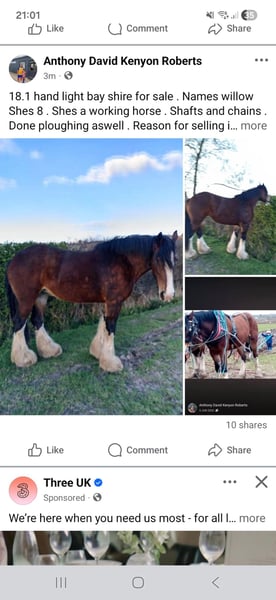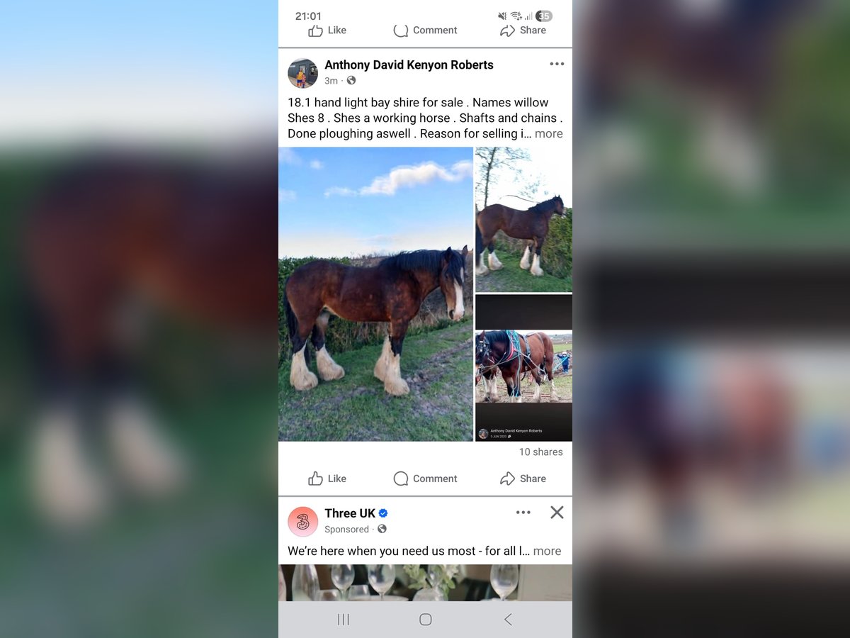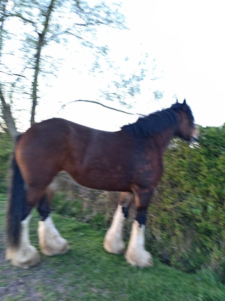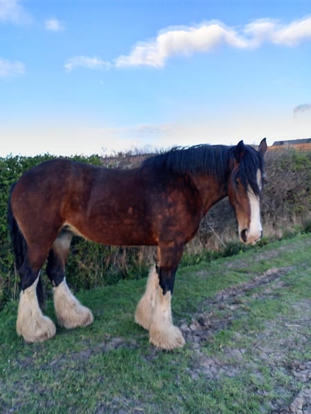 Beautiful 8 year old 18,1 hand bay mare.great temperament. Been trained in ploughing in shafts,but not done anything in a while due to owners health issues,so would rather sell and let her reach her full potential. Good at loading and with farrier .