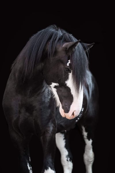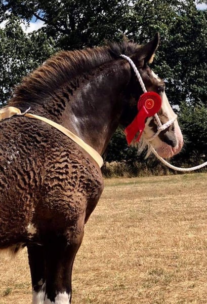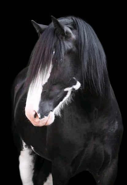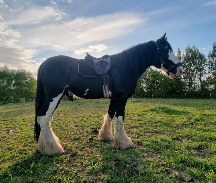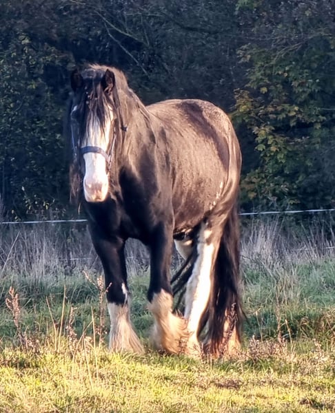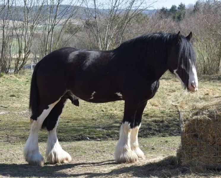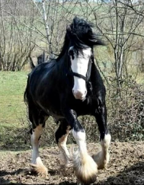 It breaks my heart, but due to health reasons, I have to part with my beloved nearly 8-year-old Shire Horse stallion. A recent pre-purchase examination including X-rays of his legs and back, as well as a blood test, is available. This cuddly giant in XXL size has SHS papers and is an extremely gentle and very affectionate gelding. He lives in a herd of mares and is completely not studdy (he has even been in an open box between a stallion and a gelding!). As is typical for a Shire, he is absolutely fearless — for example, he stands calmly while I saw wood with a chainsaw right beside him, watching with interest :-) . He has successfully covered mares multiple times and has produced beautiful foals in black and black-brown, all with a very sweet and confident character. As a foal (in England), he was awarded several prizes. He was imported from England at the age of two. Since I have taken good care of him according to the breed standards and waited until he was fully mature, he was only backed last late spring (using horsemanship methods), and he is doing great! A real "sofa" in every gait, with a calm demeanor even in traffic. He is not a kicker and can be ridden alone or stay on the pasture by himself. I also believe he would be perfect for carriage driving, as he has nerves of steel. For reimbursement of costs, I can also have him started under saddle. He will only be placed in the very best hands! I understand that not everyone has a trailer or horse transporter, so he could also be delivered. If desired, I can gladly send more pictures or videos.