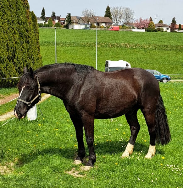 Rocky (Hergo laut Pferdepass) ist eine imposante Erscheinung mit klarem Charakter. Er ist vorwiegend ein- und zweispännig gefahren wurde aber auch freizeitgeritten. Im 2-Spänner ist er das rechte Pferd, läuft aber genauso auch links. Ein Schwarzbrauner mit viel Ausstrahlung, korrekt im Fundament, sehr guter Schritt und absolut leistungswillig. Aktuell steht er in einer großen gemischten Gruppe im Laufstall und ist beschlagen. Gesundheitlich ist Rocky bestens versorgt: Hufe werden regelmäßig bearbeitet, er ist regelmäßig geimpft und entwurmt, die Zähne wurden zuletzt im November 2025 gemacht. Er gehört zu den leichtfuttrigen Pferden und ist Chef der Herde mit ca. 30 Tieren. Er wird schon alleine durch seine Größe und Kraft nicht als Anfängerpferd abgegeben und braucht eine klare und konsequente Führung im täglichen Umgang. Er ist ein Enkel des Vize-Weltmeisters Hengst Lokan, der mit seinem polnischen Fahrer B. Kwiatek 7-mal den FEI Top Driver Award der Einspänner gewonnen hat. Rocky hat schöne Grundgangarten, mit Vorwärtsdrang und guter Aufrichtung - sowohl geritten als auch gefahren. Abgabe aus gesundheitlichen Gründen der Besitzerin.