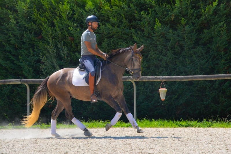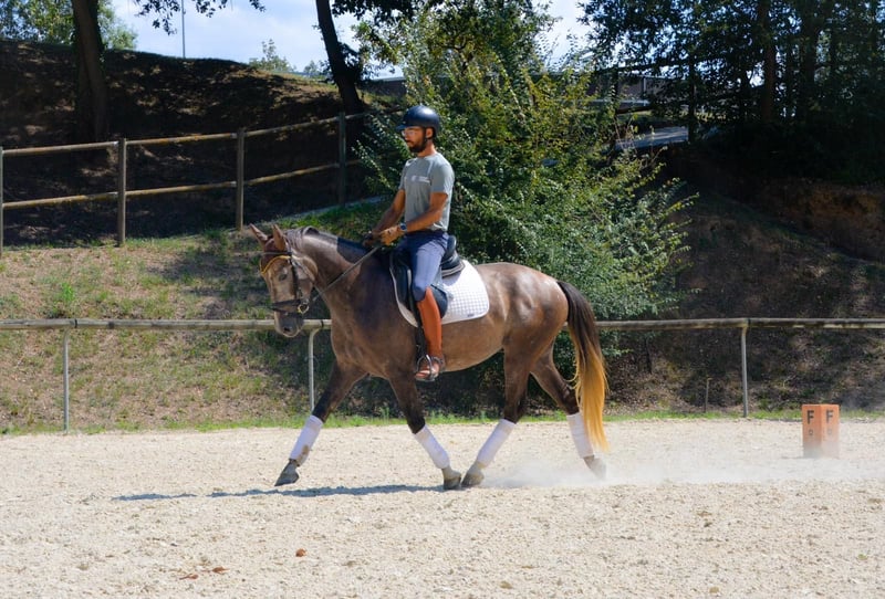 CDE 75% Pre, 25% KWPN, 4 years old, will turn 5 in 2026. Castrated, height: 1.58 m. Bitted and ridden, performs walk, trot, and canter on the arena, well-behaved and responsive, with good contact. Slightly jumping, progressing well in the field, and started in lunging on a long rein. The sire excels in jumping and dressage, currently competing in both disciplines.