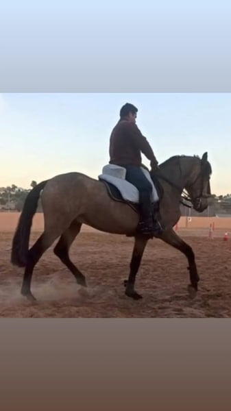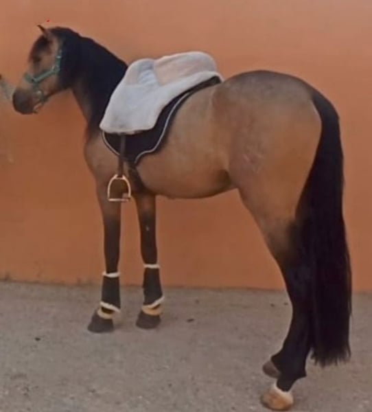 CDE HORSE mit dem Eisen von Lea VICENS. Alleiniger Besitzer seit Fohlen. Exklusives Fell Bayo en Oro. 5 Jahre alt. 1,58 in Wachstum. Registriert als Zuchthengst, aber nicht gedeckt. Eingetragen bei ANCADES. Enkel von Divo PM und dem berühmten FUEGO FG Lusitano Bayo Faivre. Vater RANCHERO AP PRE Peralta. Mutter Maestranza LUSITANA Faivre. Aufgesessen, Schritt, Trab, Galopp, Galopp und Ausführung verschiedener Dressurübungen. Eingeweiht in Cambios und Paso Español. Noble wird von Mädchen auf der Straße, auf dem Weg, auf dem Spaziergang und auf der Strecke geritten. Ideal für Junioren und Amateure. Vet Check und Tests akzeptiert. Dokumentation auf dem neuesten Stand, Revisionen, Mund getan, Impfungen und entwurmt.