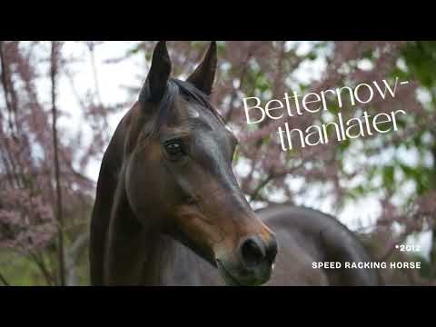 Betty verrast door haar liefdevolle, terughoudende aard en is zeer gemakkelijk in de omgang. Haar hoge vollebloedpercentage is meteen zichtbaar aan haar uitdrukking en haar prachtige hoofd. Ze is goed opgeleid en biedt een gemakkelijk te rijden, ontspannen en ijverige tölt aan. In het terrein is ze zeer onbevreesd, ontspannen en gaat zowel solo als in een groep. Ze trekt ook zonder problemen menwagens of jonge paarden. Betternowthanlater is geboren in 2012, 1,50 m groot, en een pure ras Amerikaanse Standardbred merrie, ingeschreven in het stamboek I van de Speed Racking Horses. Ze is enkele jaren geleden geïmporteerd uit de VS en kan op de Auenhof worden leren kennen en natuurlijk proefgereden worden.
