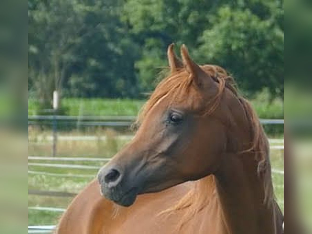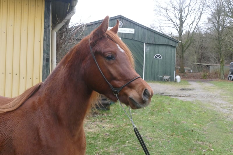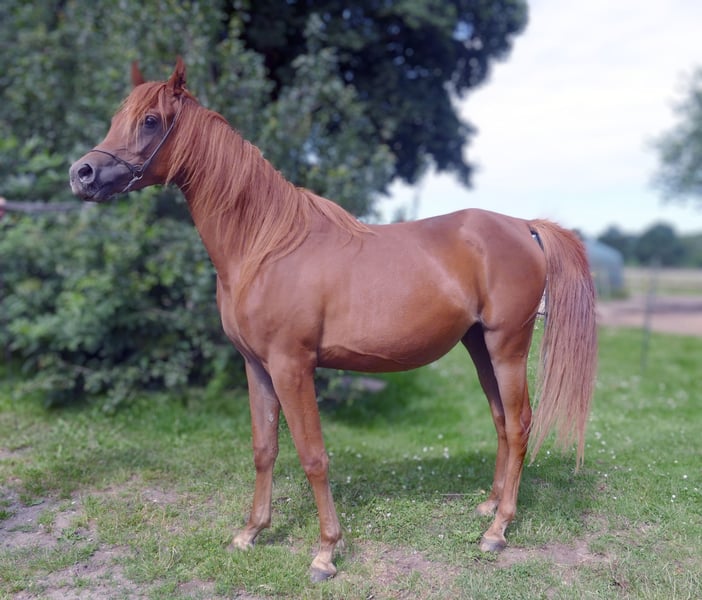 Myada is searching for her people and a meaningful task... She is a stunning young mare with a lot of presence, beautiful movement, and an excellent conformation. Her pedigree is exciting, sired by NK Nagwan out of True Mahari by True Colours. She closely resembles her dam, a successful breeding mare with show achievements, and clearly has potential in that direction. At the same time, she is cool and brave, confident, intelligent, and has a strong, well-built physique. We can easily imagine her as a Western or leisure horse as well. All our young horses are raised in an open stall from birth, weaned late and gently, and then live in groups of young horses with plenty of space. They are very well socialized, healthy, and fit. Myada has never been ill and is roughly mid to high-ranking within her group. Expected height is approximately 15.0 to 15.2 hh. She is halter-trained, familiar with the farrier, veterinarian, tractor, cars, cats, dogs, and everything else on the farm. She is gentle to handle for grooming and detangling her beautiful, long mane. Otherwise, she is still quite raw and untrained.